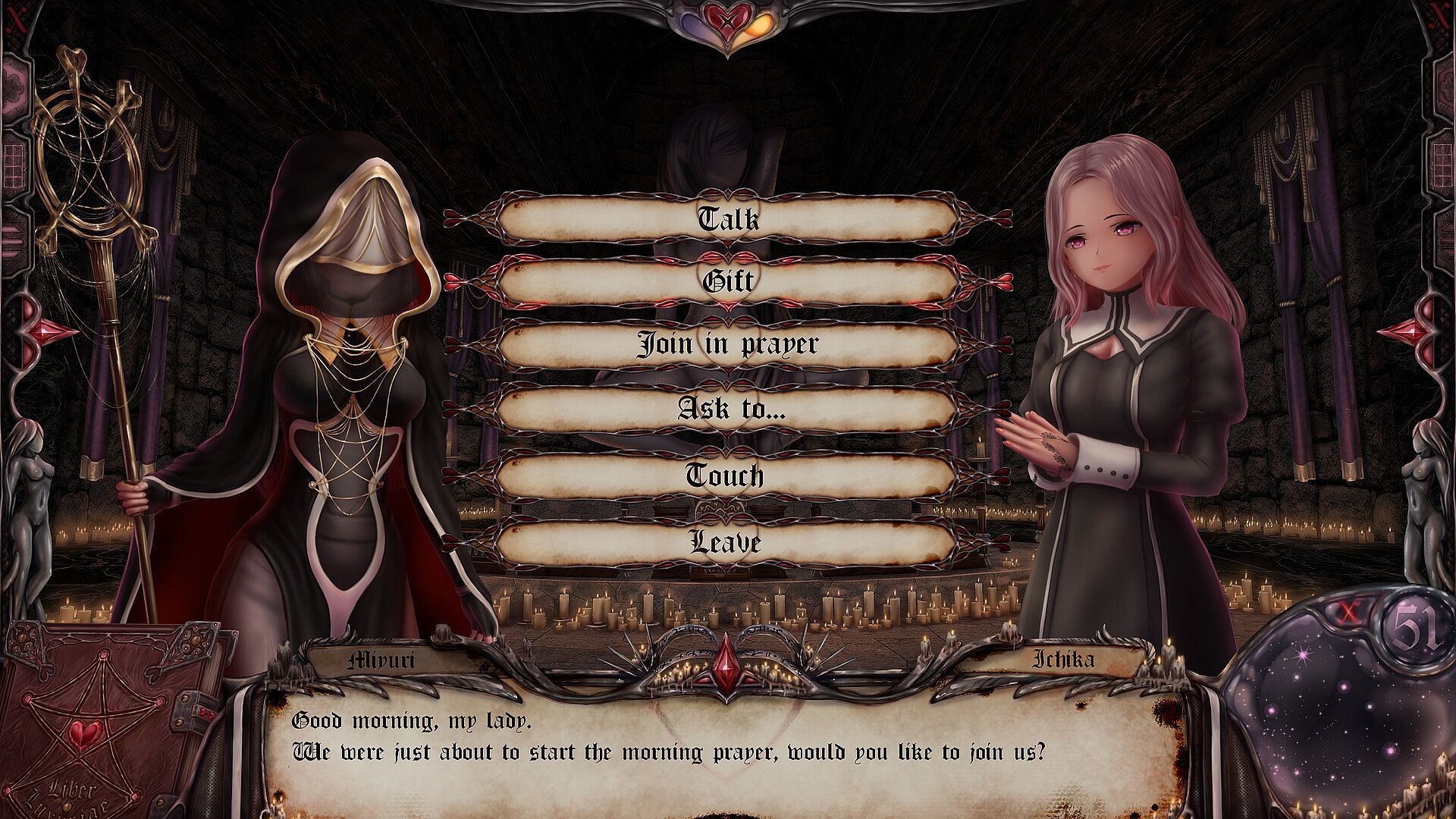 Inspect your nuns bio to see how much they love you and how corrupt they’ve become. Peer into their minds to Discover their evolving thoughts about you and the temple.