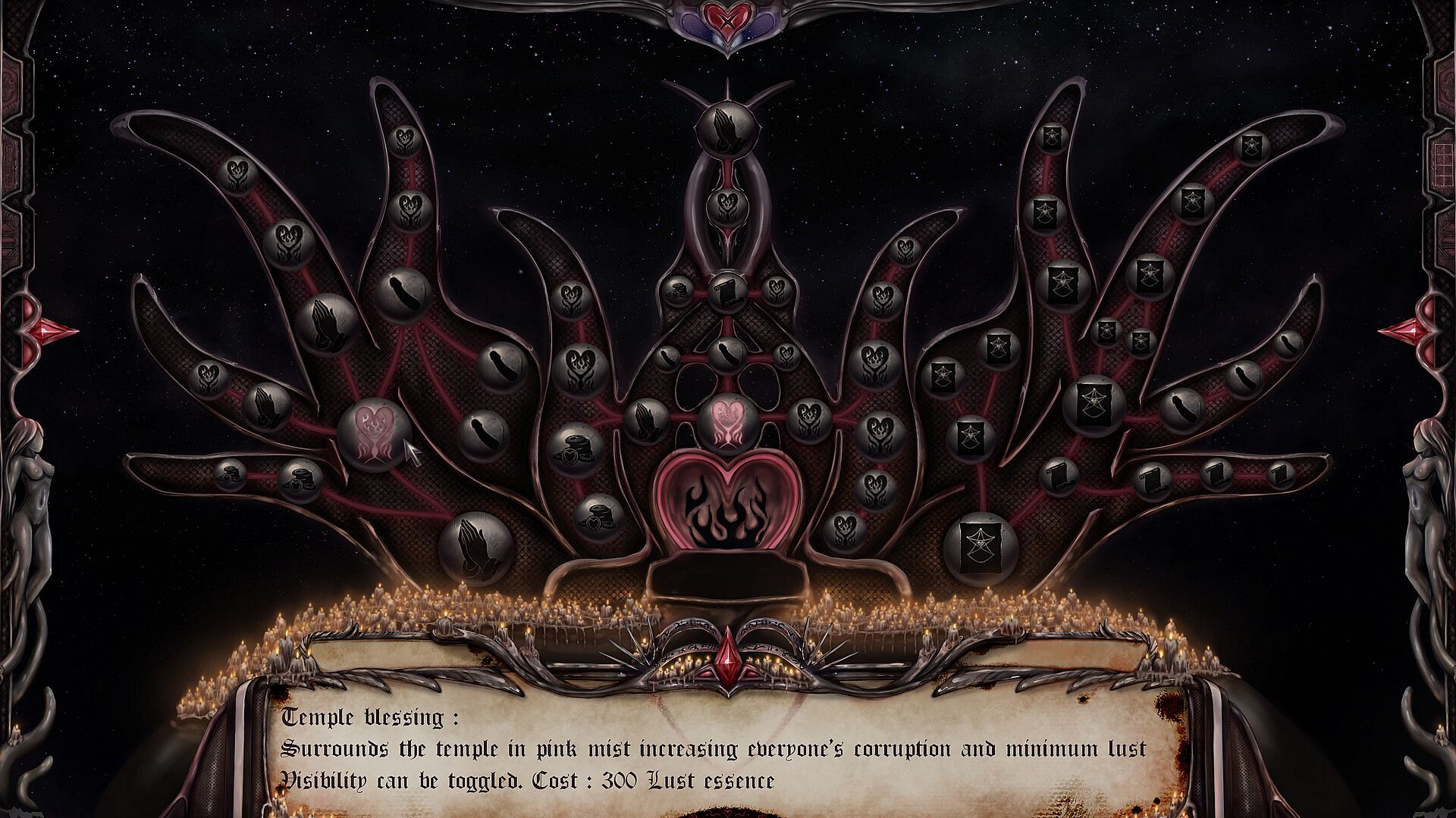 Use your gathered lust essence to unlock blessings, new spells and progress the awakening