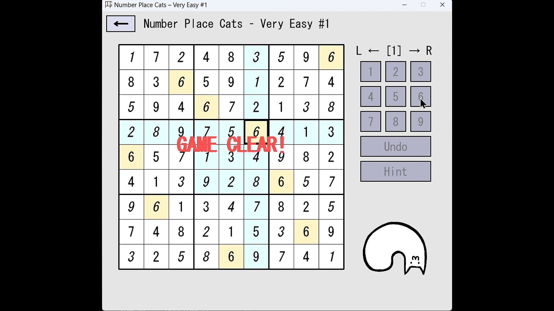 A number place (Sudoku) puzzle with cute cats that beginners can enjoy. There are 100 puzzles of different difficulty levels, totaling 900 puzzles. With erase function, back move function and hint function, you can challenge yourself to solve difficult puzzle. The cute cat changes pose every time you write a number, giving you a sense of relaxation.