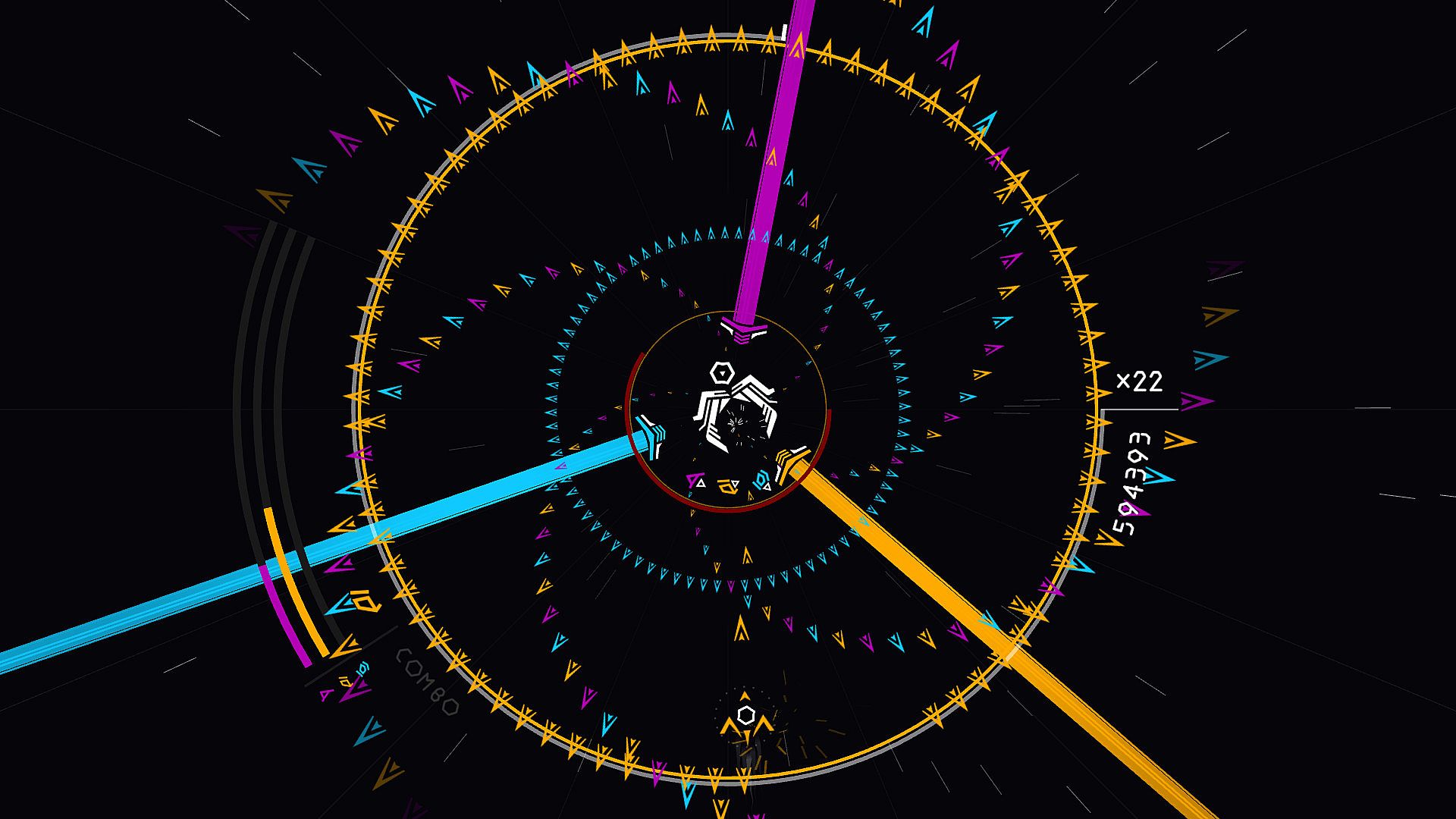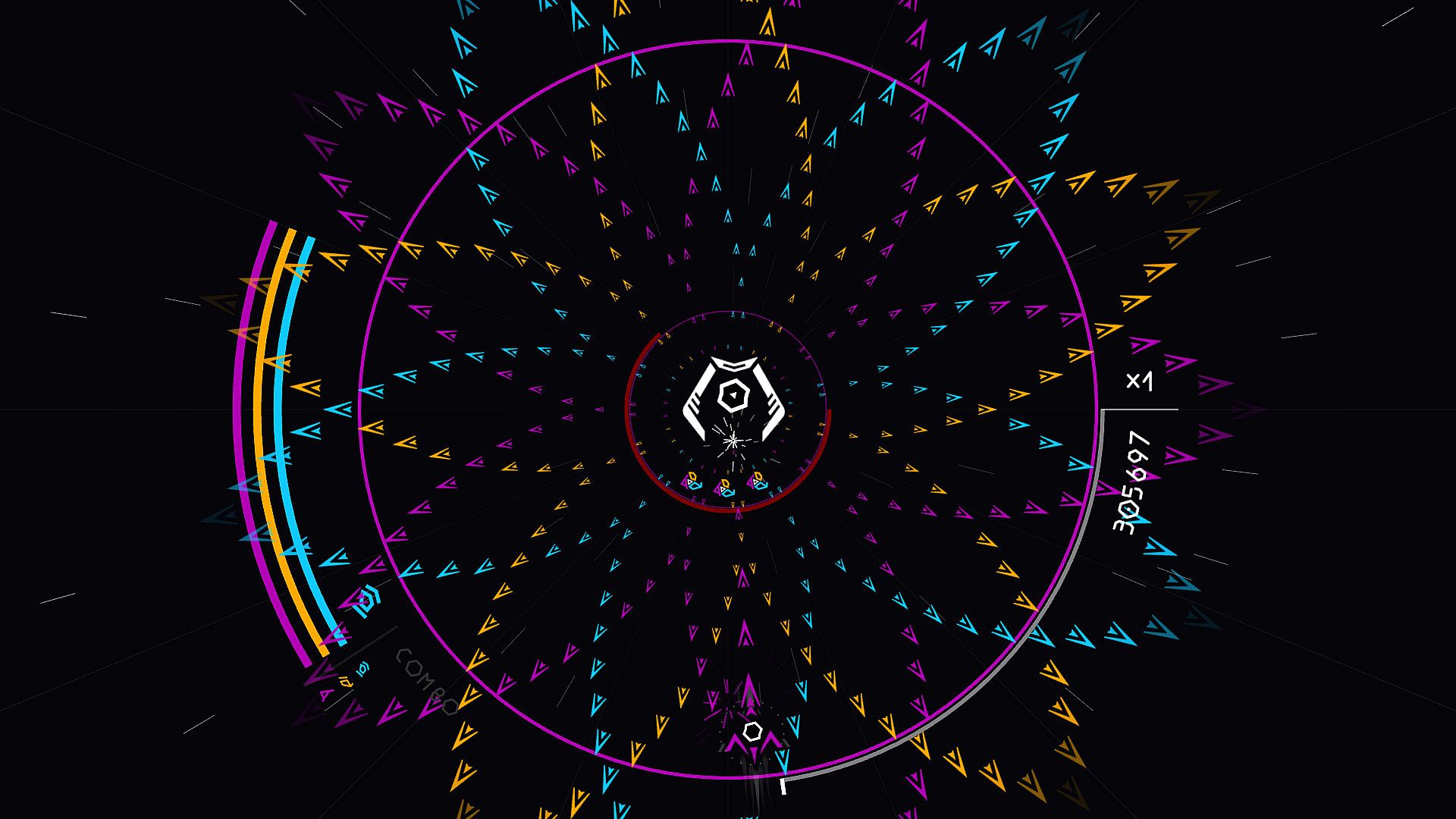 Outskirts throws you in a circular and enemy-flooded board. Unlike other well-known shoot ‘em ups, there’s no scrolling in the game, everything evolves around the center of the screen. Three colors are dominating the battlefield: wear one of them to be immuned against bullets of the same element. Switch between them and put down your foes to gain power and unleash powerful weapons. Killing enemies in the proper order will make you achieve a combo and gain bonus points or bonus score multiplier. You can also do a combo of combos, which will unlock a true hidden power.