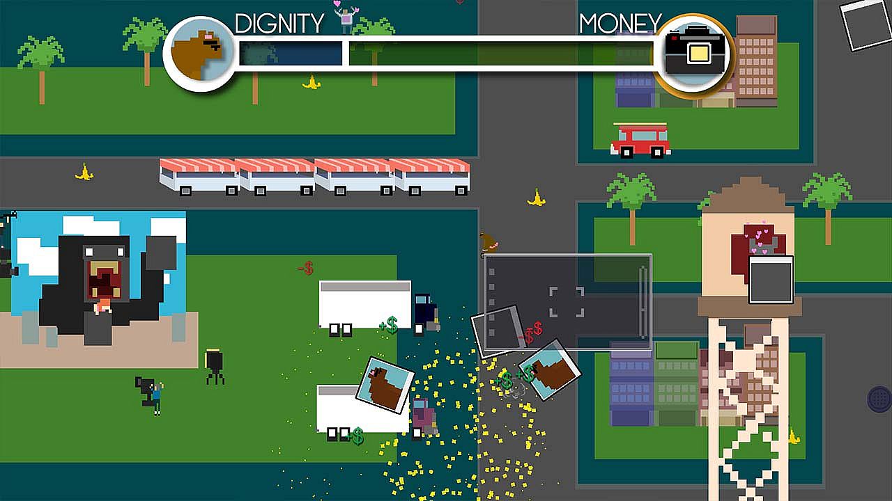 Each match is a tug-of-war battle between a celebrity (battling for dignity) and a paparazzo (battling for money). When the paparazzo player takes a picture of the celebrity, the paparazzo gains money while the celebrity loses dignity. If the celebrity collects an adoring fan, they regain a chunk of their dignity. At the end of each round, when the celebrity reaches the limo, the winner is the player that has more dignity or money!