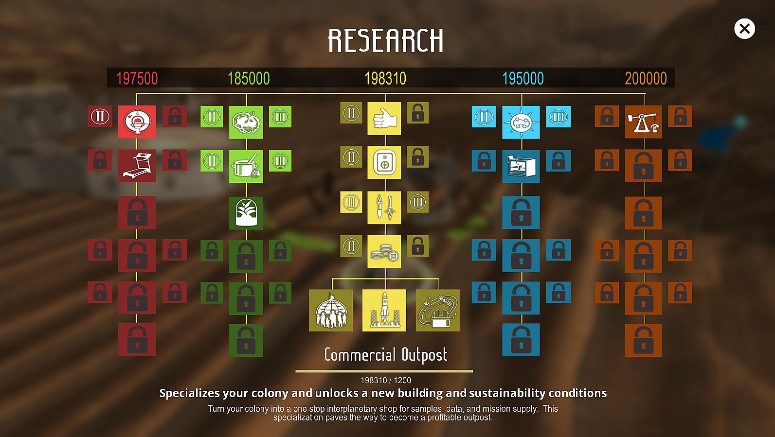 Spend research points in five different trees with 71 possible upgrades. This includes three different colony specializations that determine your path to sustainability and change the way you win the game.