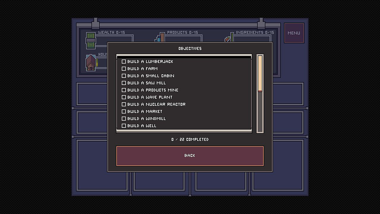 The goal of the game is to complete all the objectives, an objective can be to build a certain building or to have a given amount of a resource.