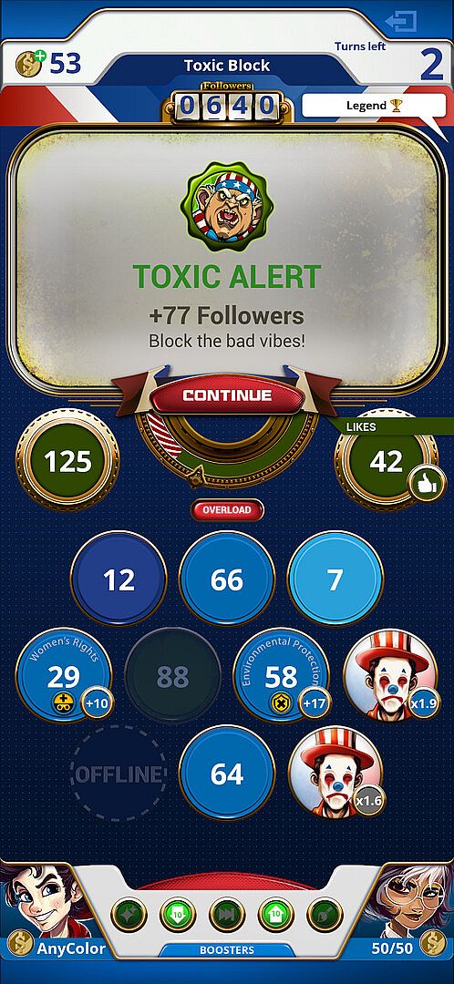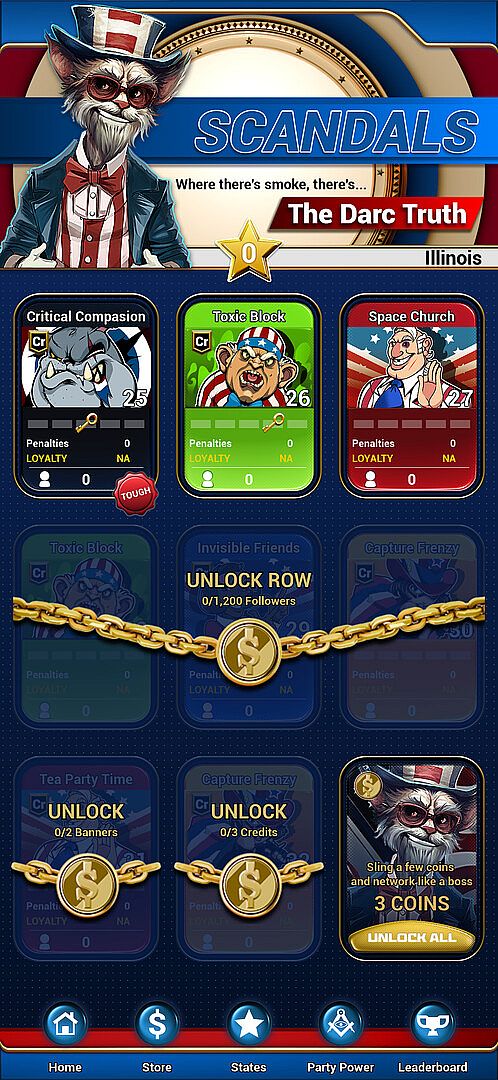 Dive into Political Party Frenzy, the ultimate casual puzzler with a patriotic twist, full of the charm and wit of Americana. Master the challenges, tackle hundreds of scandals, compete on leaderboards, and enjoy the wild antics of American politics. Can you lead your party to the top?
