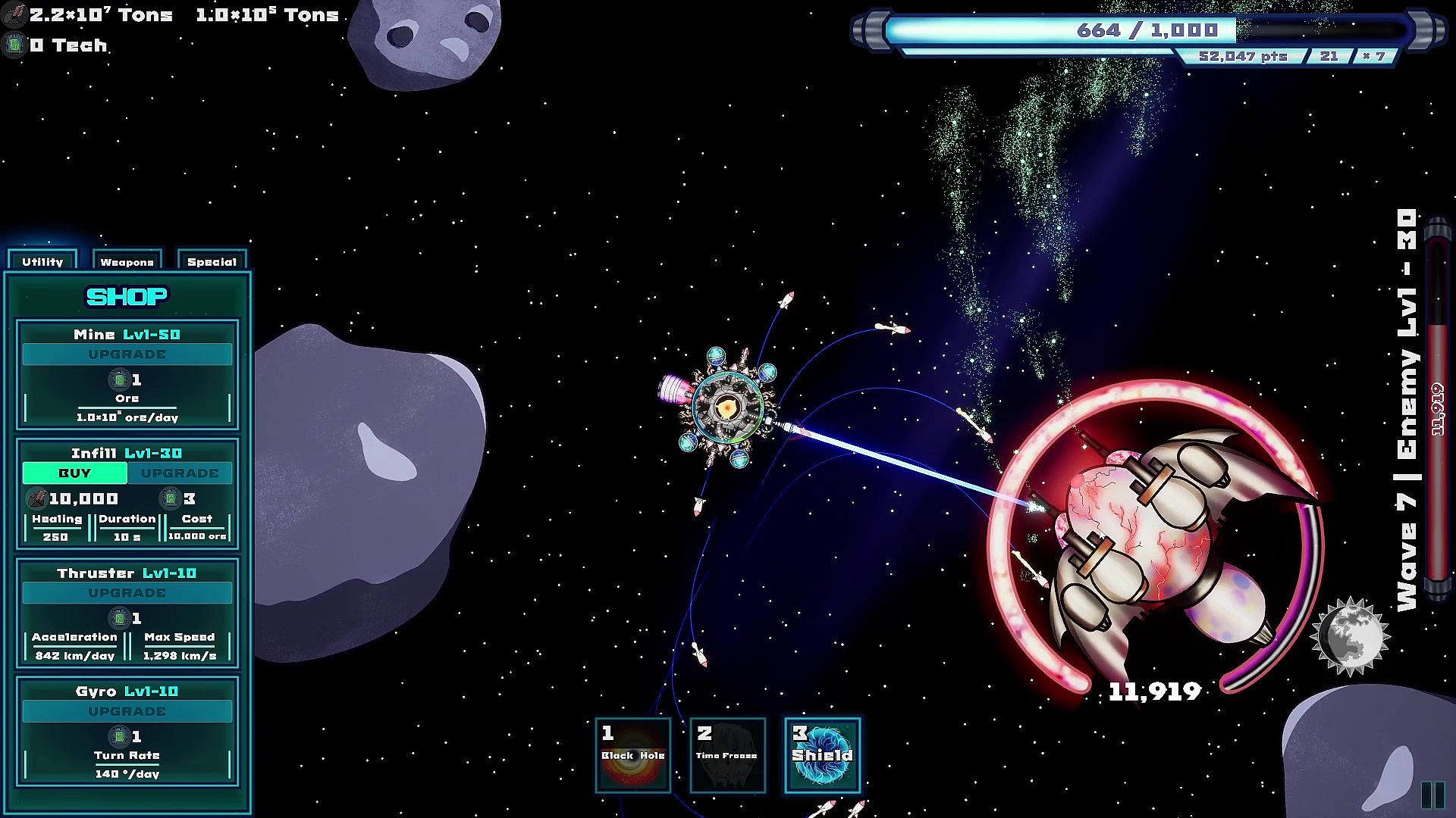 Earth has suddenly been thrust into the center of a galactic warzone, and now you must take charge and prepare mighty defenses. The aliens never let up for long, so you must carefully divide your attention between combating them and spending your resources. You may crush aliens with the moon or overwhelm them with your extreme partying, but they will only grow stronger. How long can you hold them off?