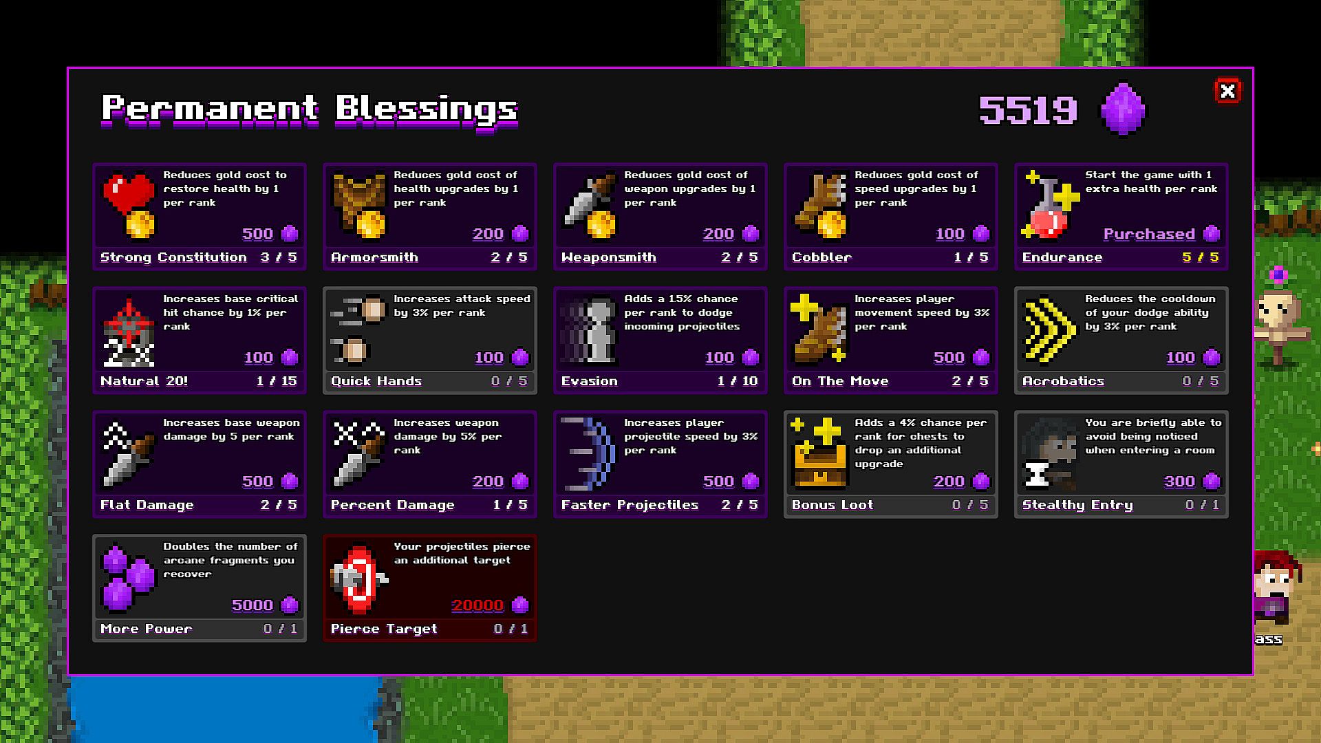 Dying is just the beginning with the permanent blessings shop. Just collect the purple arcane fragments while you play to spend on permanent upgrades to make you stronger. Procedurally generated maps, randomly filled stores / chests, and the different playstyles / feeling of the characters makes for a different experience on each run.