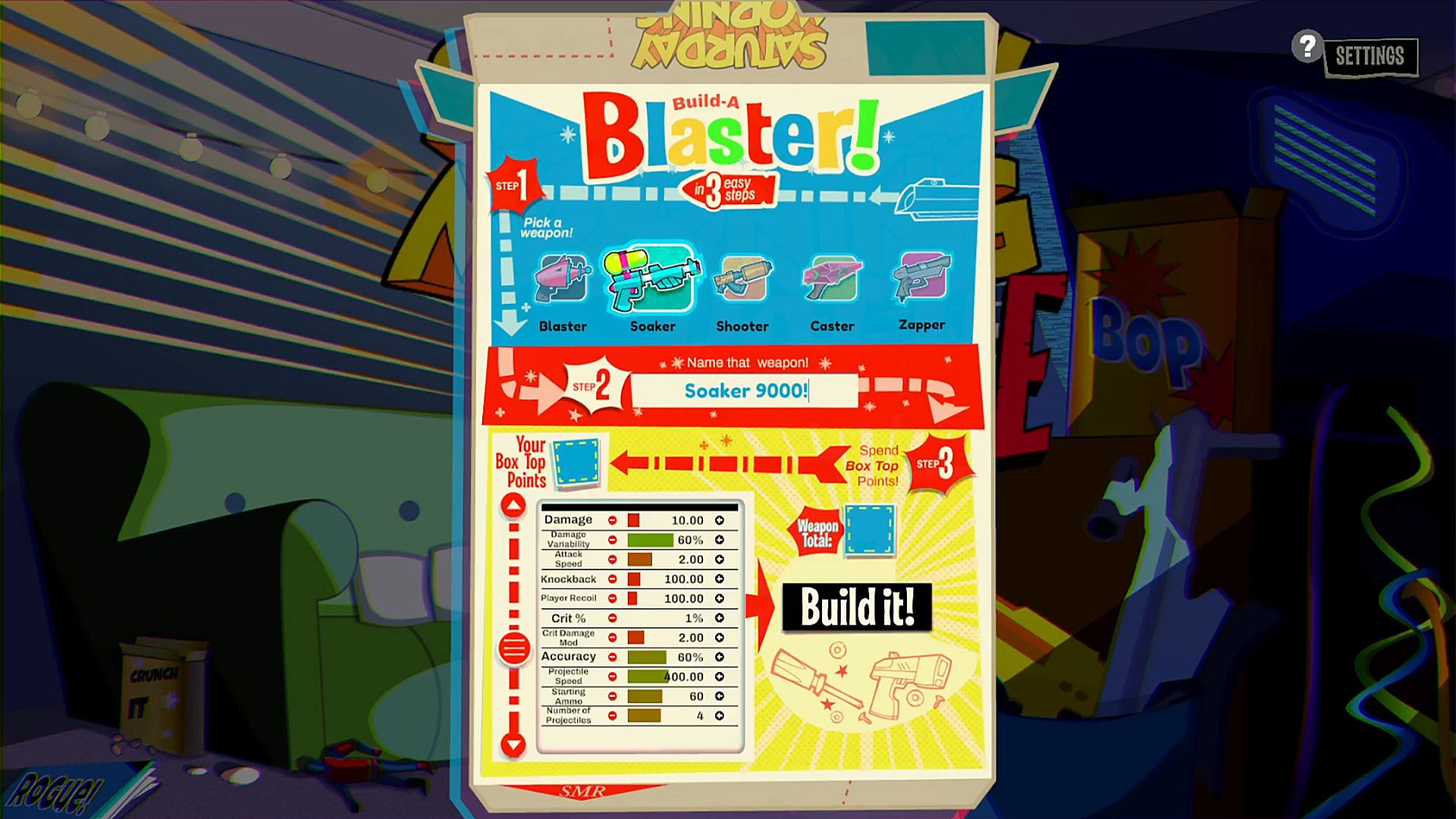 Saturday Morning Rogue is the top-down 2D roguelike where custom crafted weapons are the only way you're getting out alive. Pick up persistent custom weapons and armor of past players that are now stuck in Saturday morning forever. If you're going to defeat the villains of each realm and destroy the corporate machine you'll need to build some serious equipment of your own. Want more damage? do it. Need to push yourself across the map with explosive recoil? Go wild. The power is yours to create terrifying tools of destruction or hilarious weapons that never should have left the toy aisle!