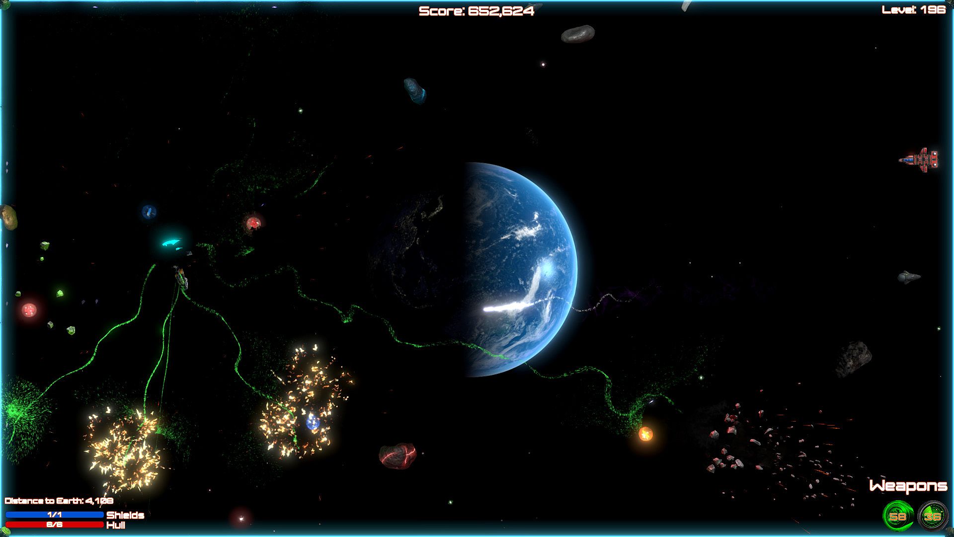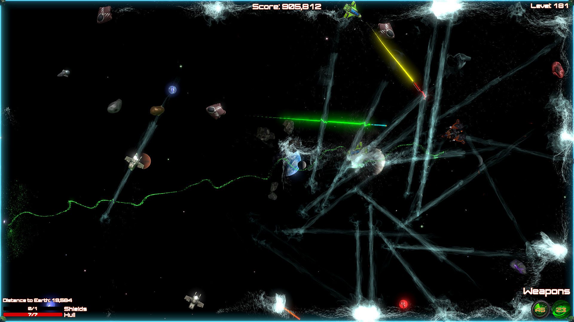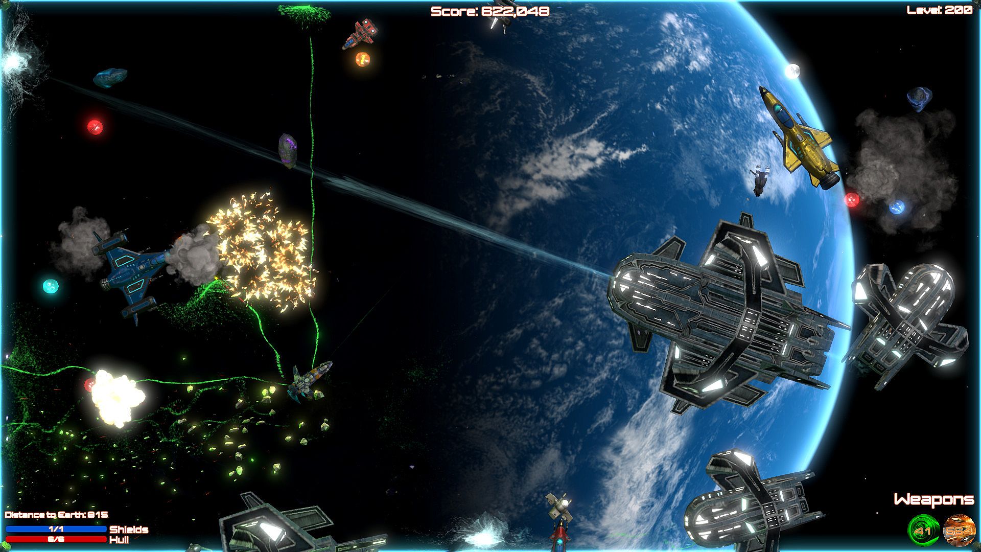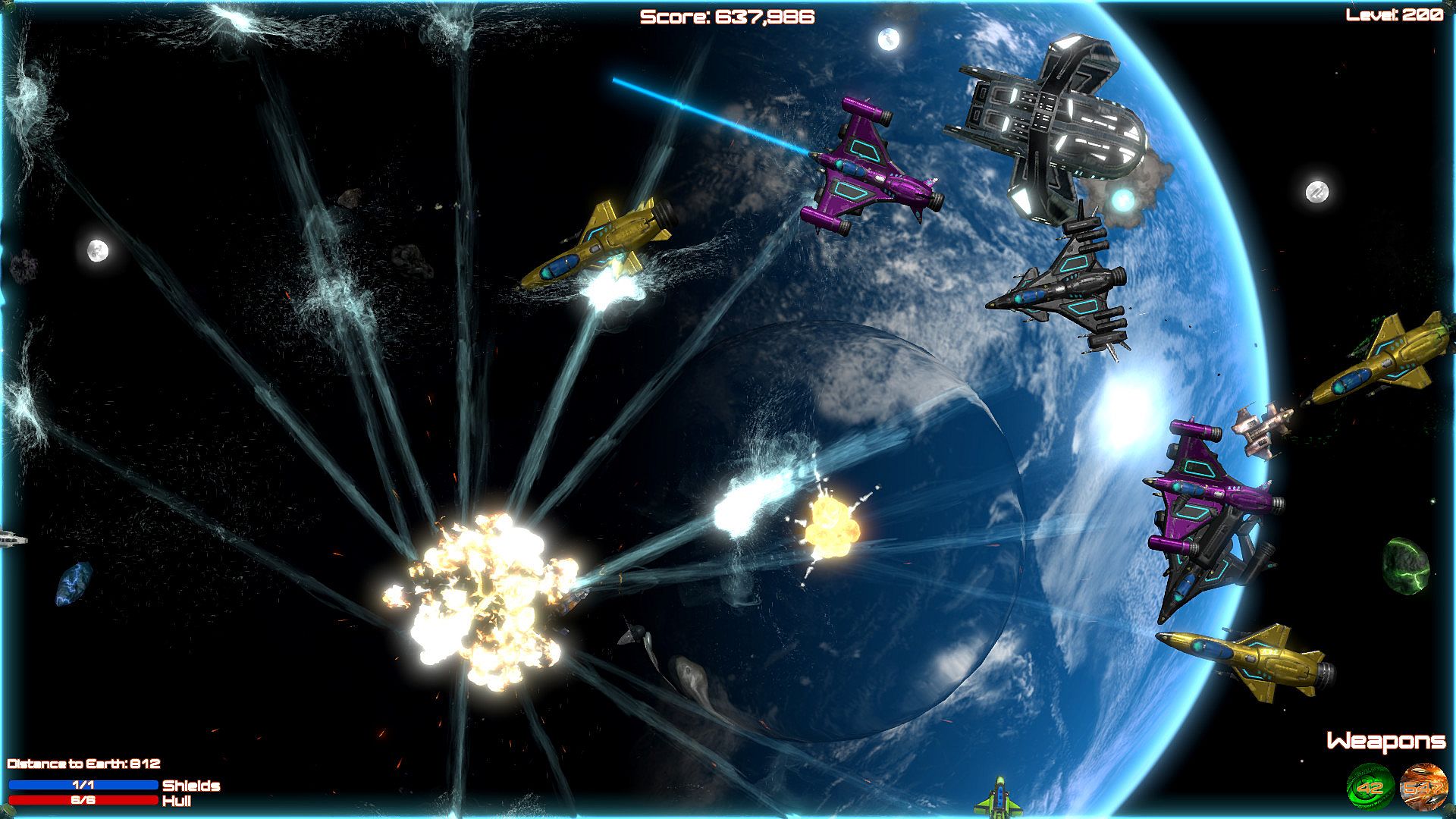 Blast aliens invading Planet Earth in this shoot 'em up bullet hell game on PC. Pilot your ship through 200 levels, firing weapons while dodging enemy attacks in space. Ram foes when ammo runs low, grab power-ups, and unlock new ships to push through custom difficulty settings. Relax with soft music or switch to rock tracks during casual play sessions. Full controller support, Steam achievements, leaderboards, and cloud saves keep progress smooth. This indie action title runs on nearly any PC, even 10-15-year-old hardware, perfect for bored players killing time.