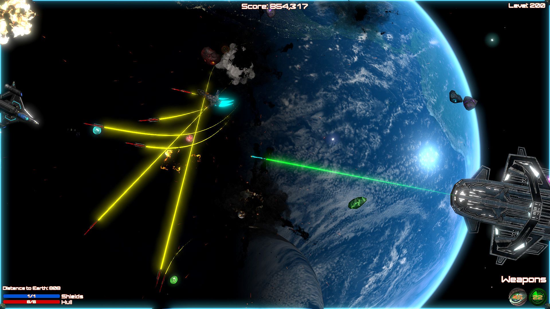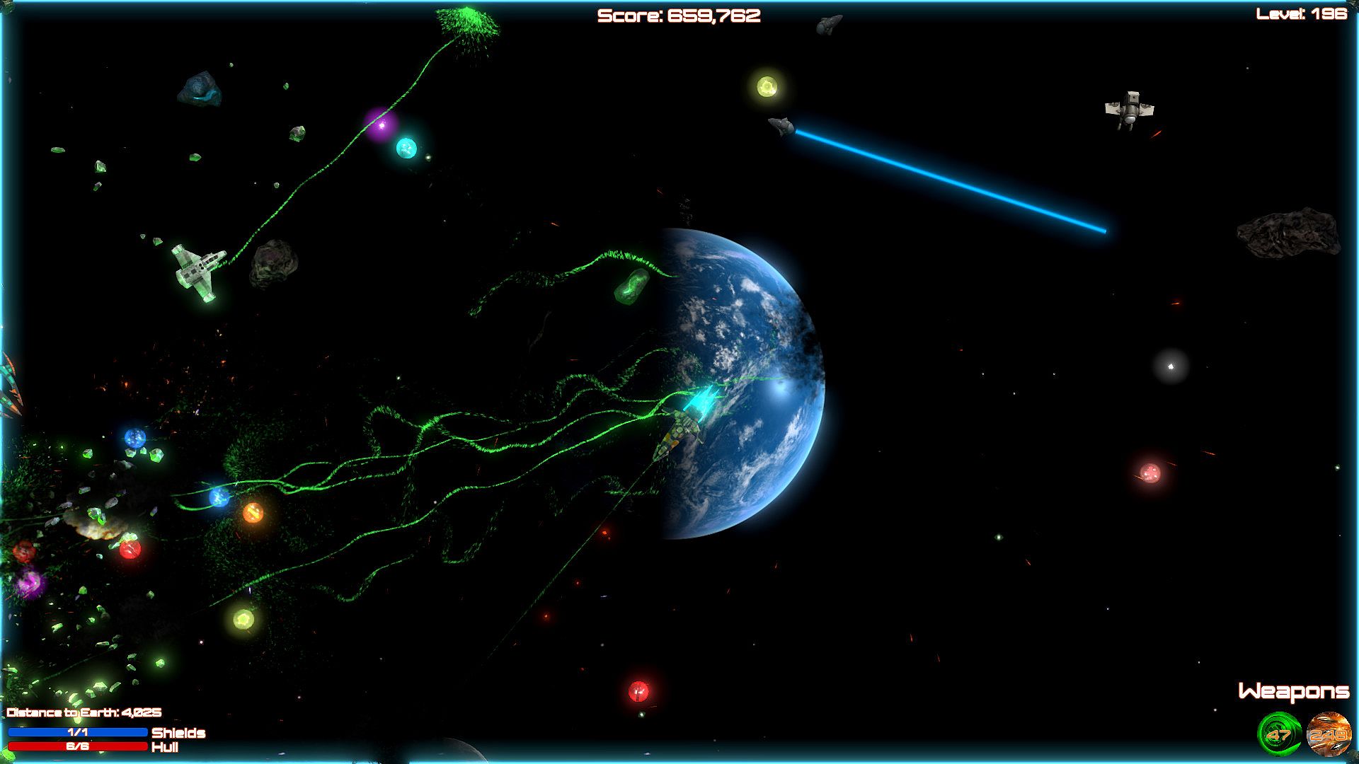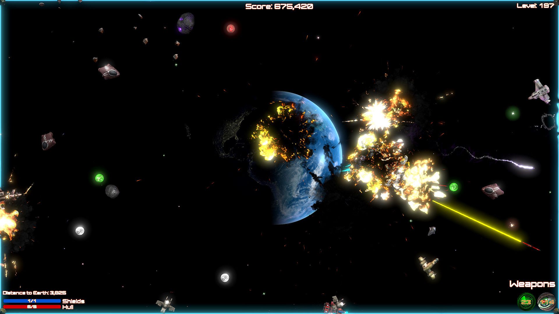 Blast aliens invading Planet Earth in this shoot 'em up bullet hell game on PC. Pilot your ship through 200 levels, firing weapons while dodging enemy attacks in space. Ram foes when ammo runs low, grab power-ups, and unlock new ships to push through custom difficulty settings. Relax with soft music or switch to rock tracks during casual play sessions. Full controller support, Steam achievements, leaderboards, and cloud saves keep progress smooth. This indie action title runs on nearly any PC, even 10-15-year-old hardware, perfect for bored players killing time.