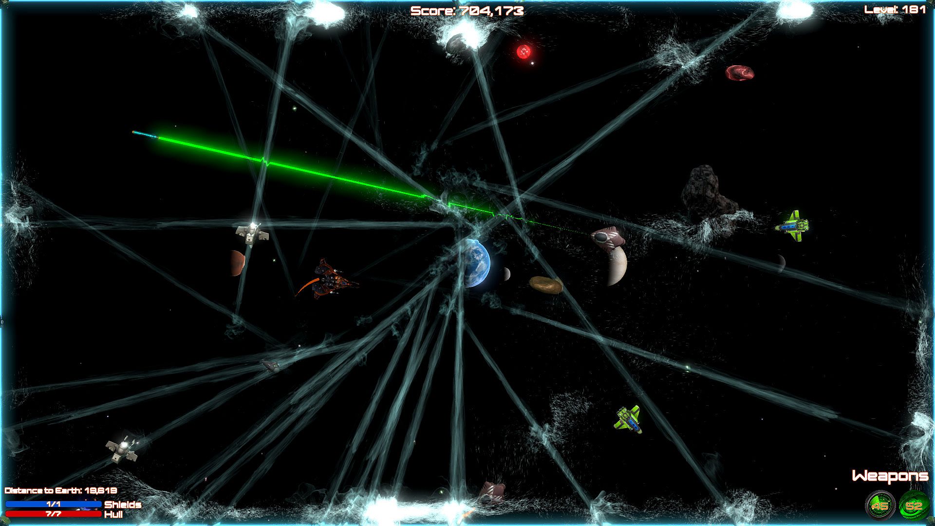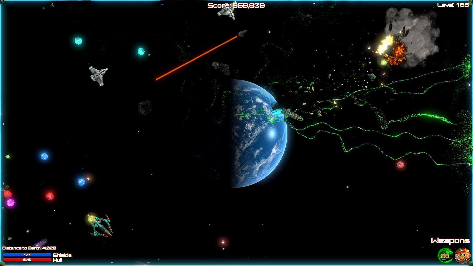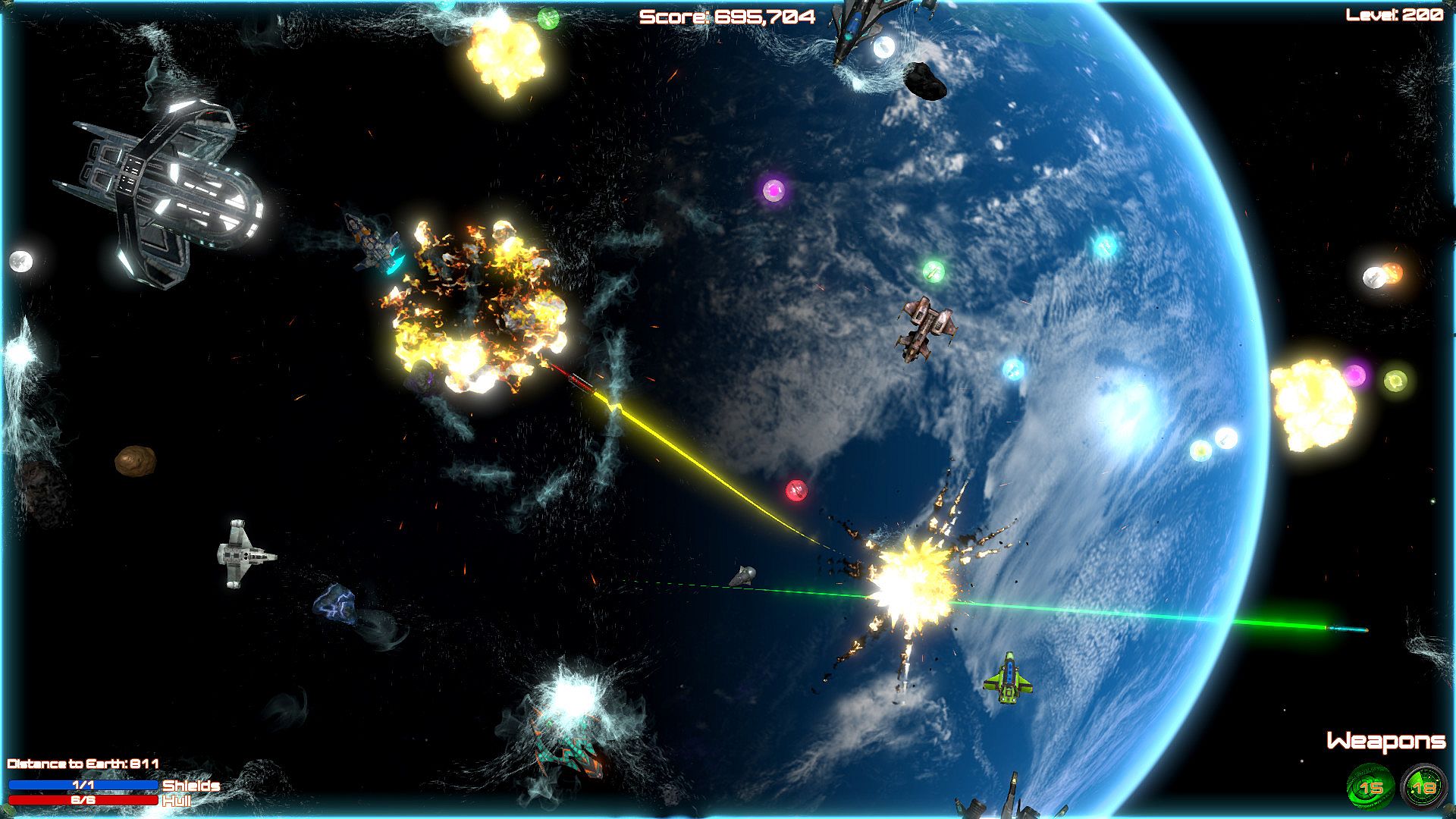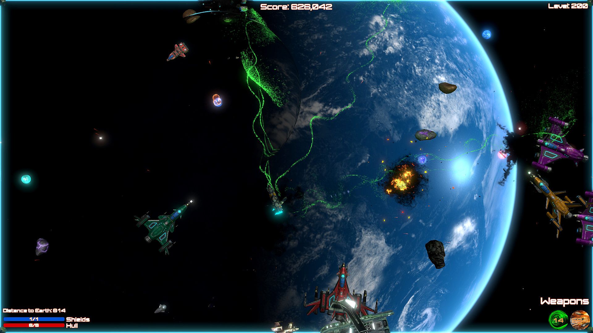 Blast aliens invading Planet Earth in this shoot 'em up bullet hell game on PC. Pilot your ship through 200 levels, firing weapons while dodging enemy attacks in space. Ram foes when ammo runs low, grab power-ups, and unlock new ships to push through custom difficulty settings. Relax with soft music or switch to rock tracks during casual play sessions. Full controller support, Steam achievements, leaderboards, and cloud saves keep progress smooth. This indie action title runs on nearly any PC, even 10-15-year-old hardware, perfect for bored players killing time.