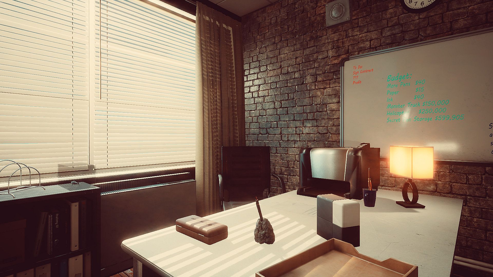 Explore a silly office sandbox full of quirky pens, pencils, utensils, and puzzles. Find a way around your awful luck and sign that contract!