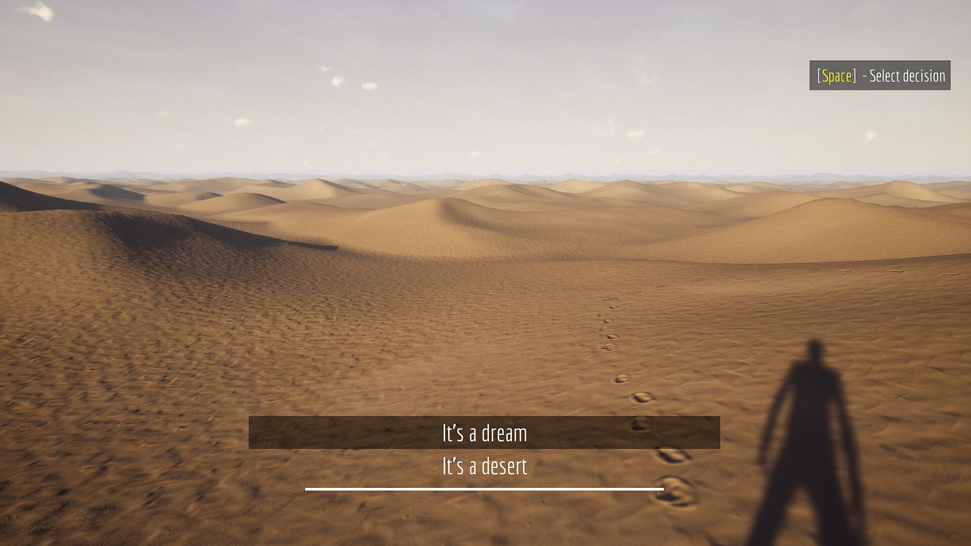 Soliloquy is a narrative adventure game /walking sim that explores the depths of existence, faith and the human condition. It’s a story about a man stranded in a desert just to perform for a demiurge, the divine entity that created it.