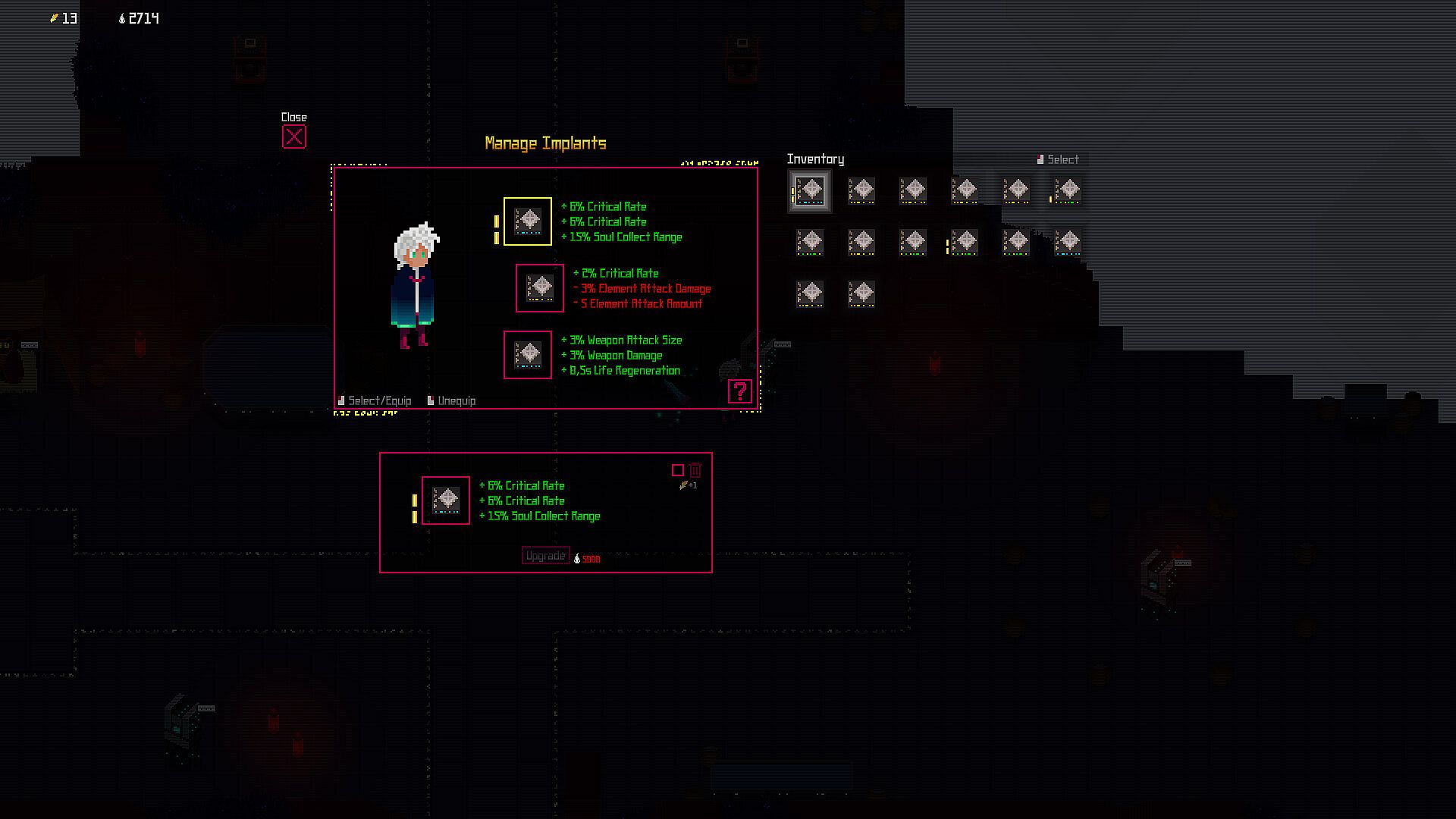 • Upgrade your souls, weapons and implants to strenghten your character.