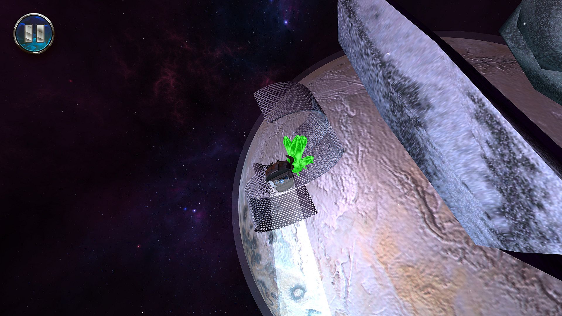 On a mission of exploration, the HMS Stellar Flame has run out of fuel. In order to ensure that its mission can be completed, you must locate and secure rare picolinium crystals throughout the galaxy. To accomplish this goal, a mining drone with a special grapple is deployed, and must swing from asteroid to asteroid in order to get to the massive picolinium crystals and beam back the rare, pure picolinium deposits to the Stellar Flame.
