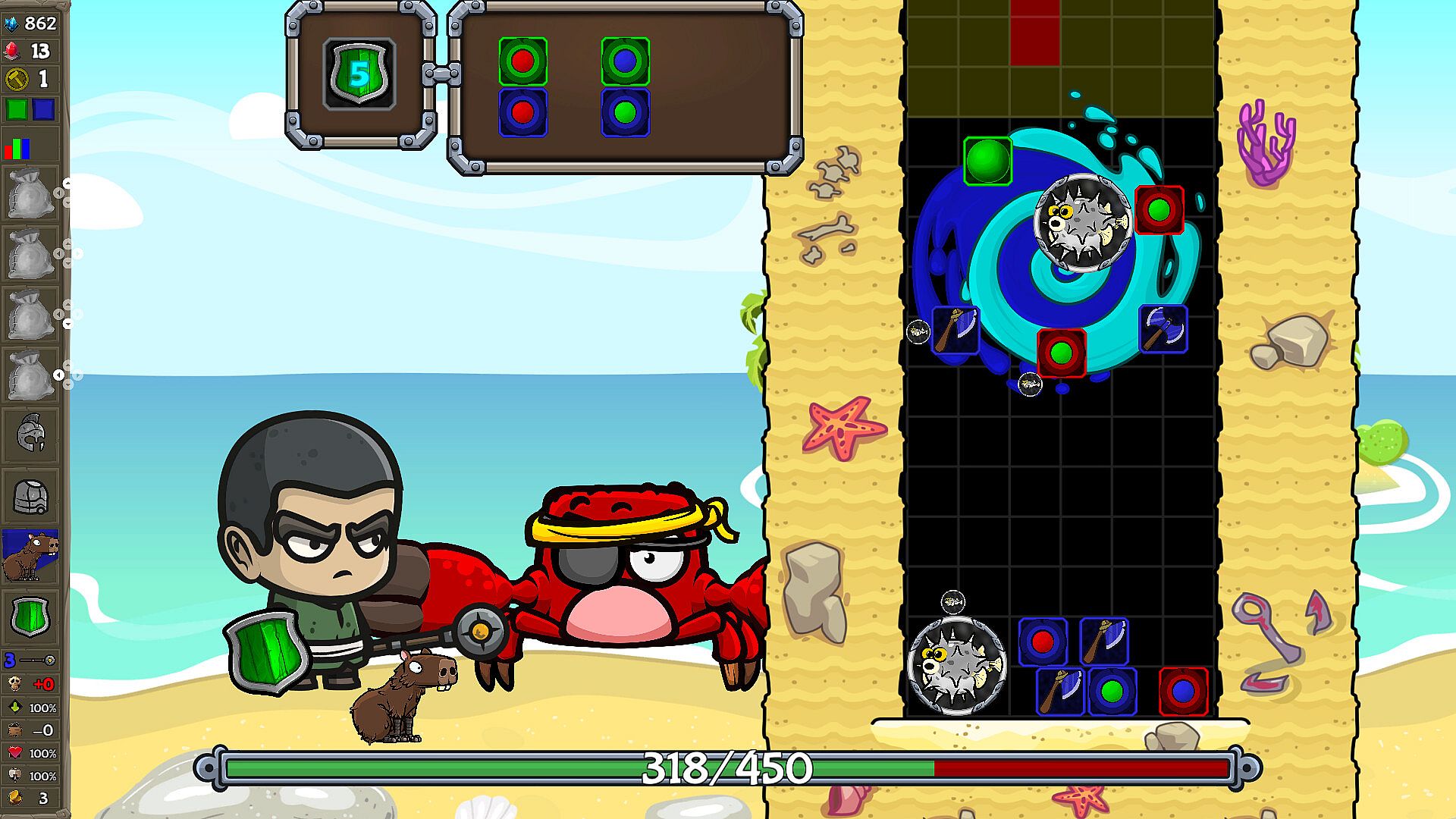 Answer the king's call to recover the stolen royal colors from Demon Grau in this real-time puzzle combat adventure. Battle Grau and his minions by moving and dropping matching color pieces in groups of three or more, while foes counter with their own drops. Choose your route through procedurally generated maps, recruit allies, and equip weapons, shields, armor, artifacts, or pets to build your strength. Six distinct weapons alter puzzle dynamics for varied fights, and adjustable difficulty lets you tackle challenges at your pace. Indie strategy RPG fans who enjoy replayable levels and gear customization find a perfect fit here. Procedural maps ensure fresh paths, friends, and enemies every playthrough on PC.