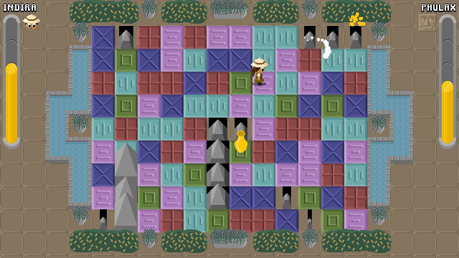 Keyboard battles mouse in this fast-paced indie action game set inside an ancient temple. One player guides Indira as she dashes through chambers to grab five treasure pieces while dodging traps. The other commands Phulax to block her escape by rearranging floor tiles and matching three of the same color to spawn hazards. Face off in the Bridge, where Phulax erases platforms to drop Indira into the abyss. Navigate the Courtyard's spikes that can smash treasure or the runner. Survive the Crypt's rolling boulders in tense chases. Quick thinkers and competitive duos thrive on these asymmetrical showdowns.