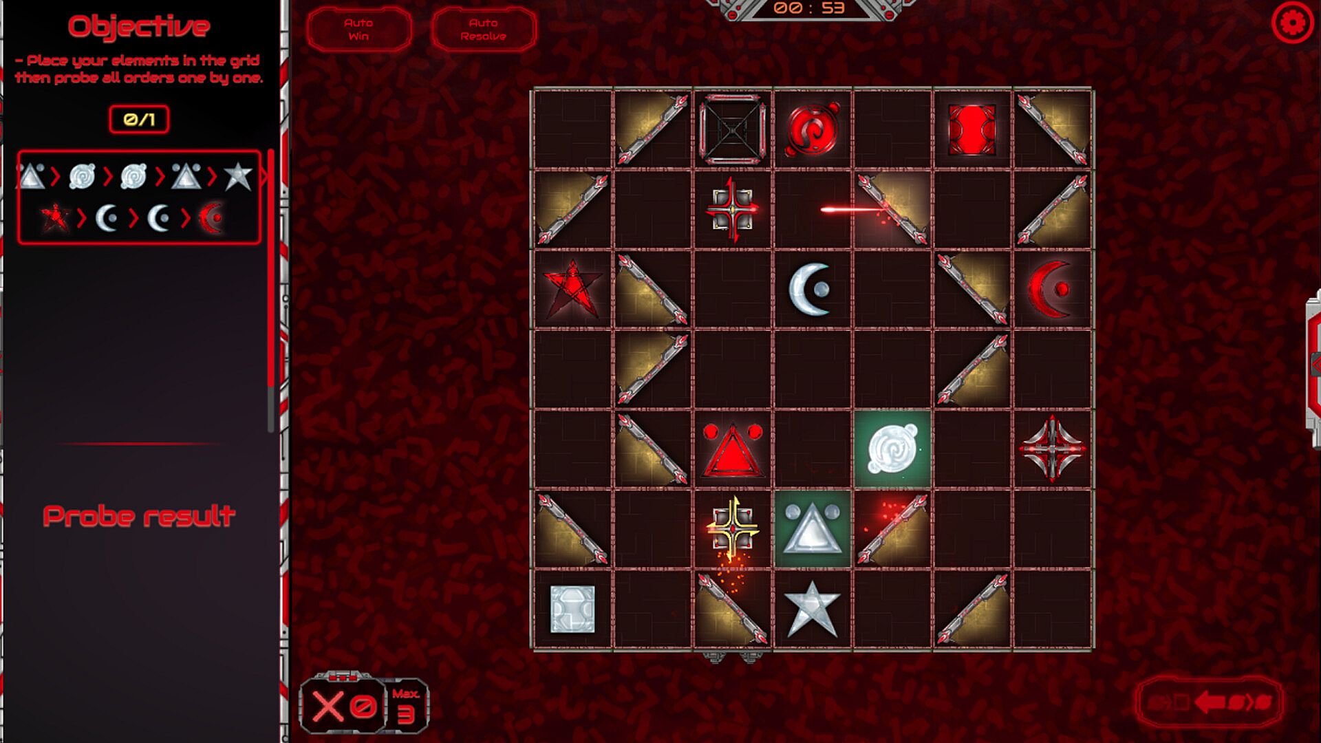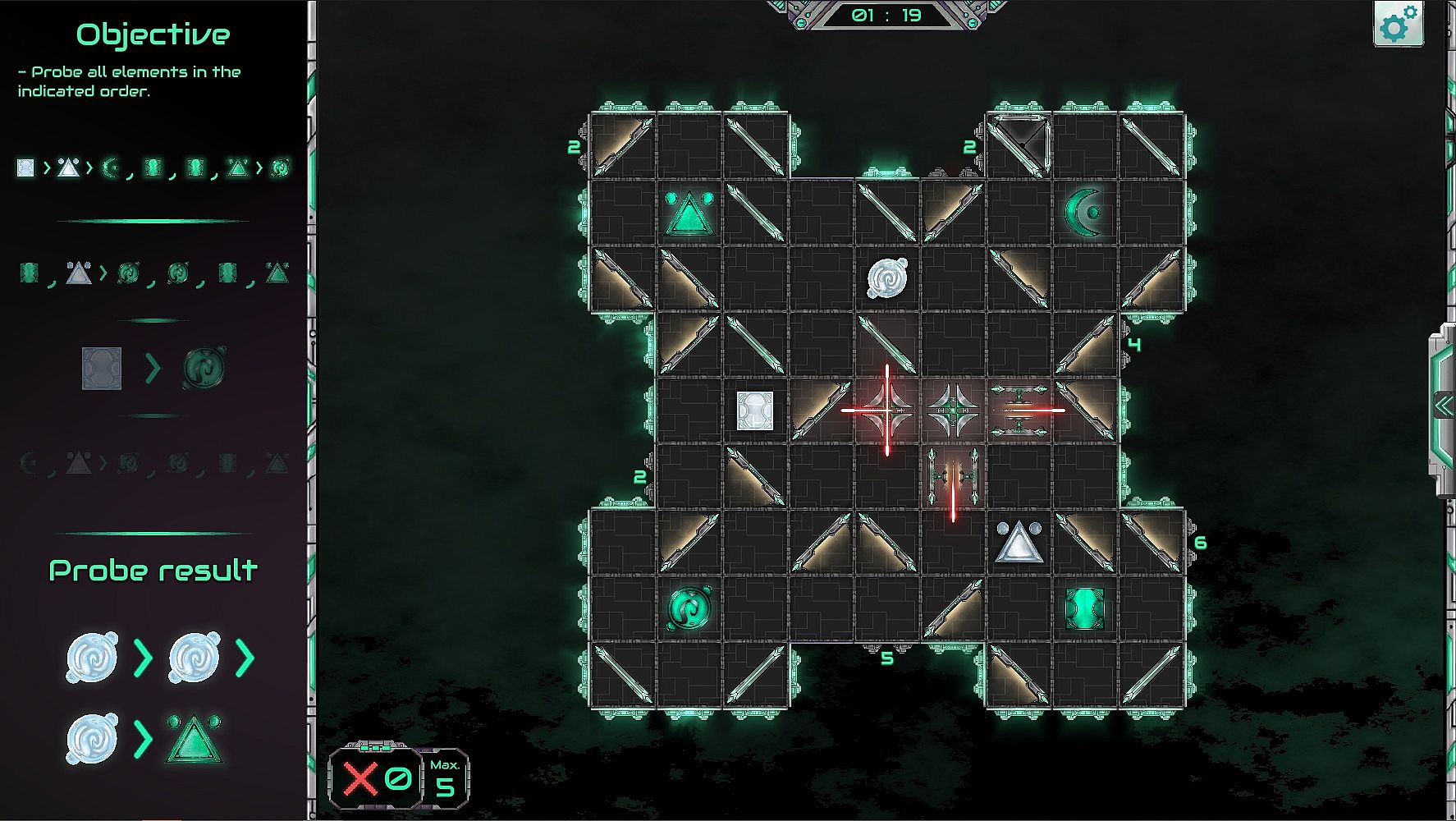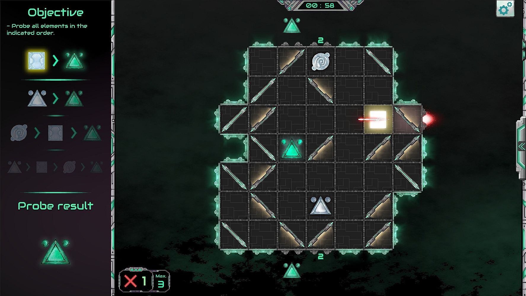 Open levels probe Order: In this game mode, players must choose carefully which lasers to trigger in order to touch the elements in a specified order. This game mode requires strategies and planification.