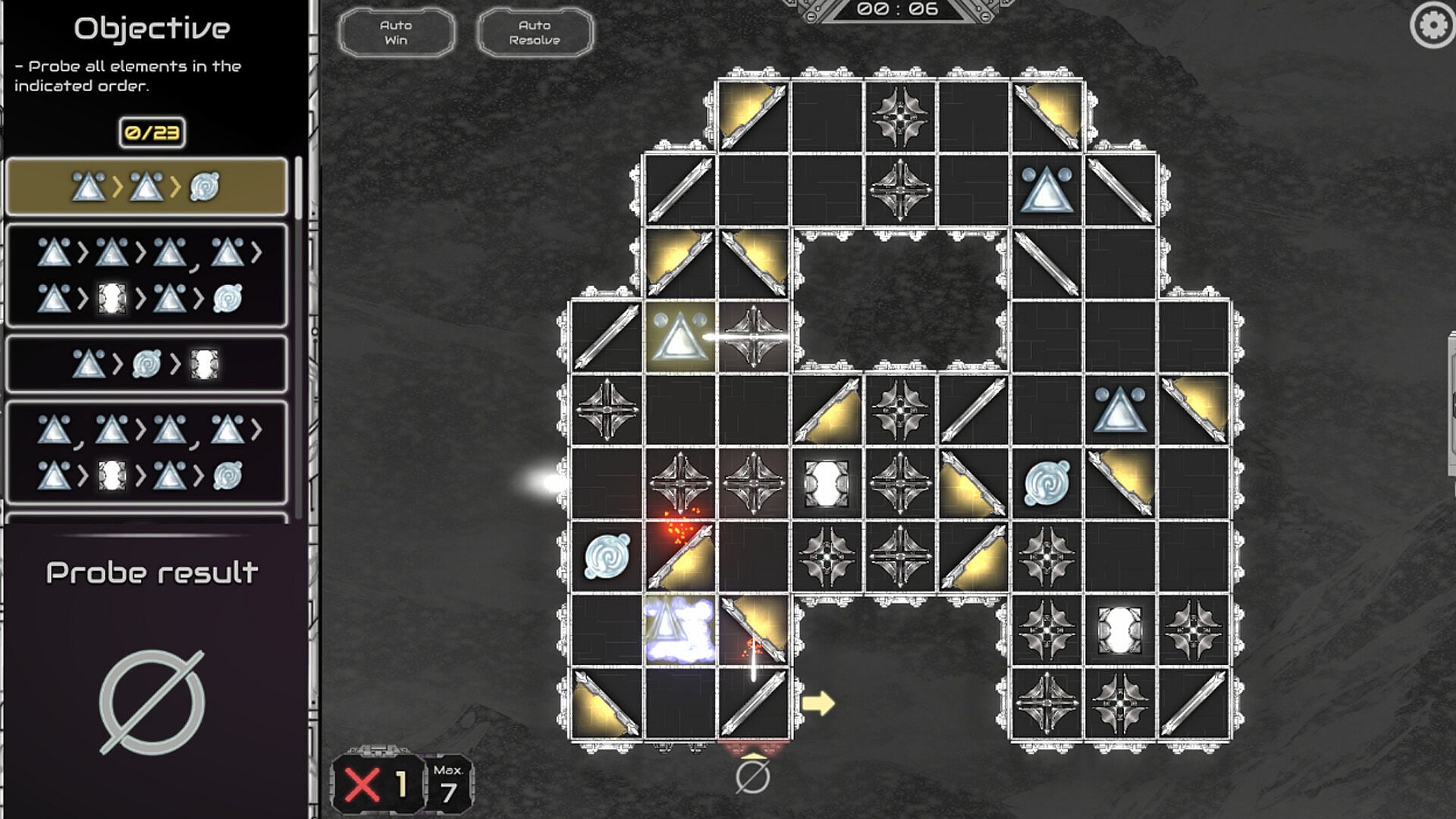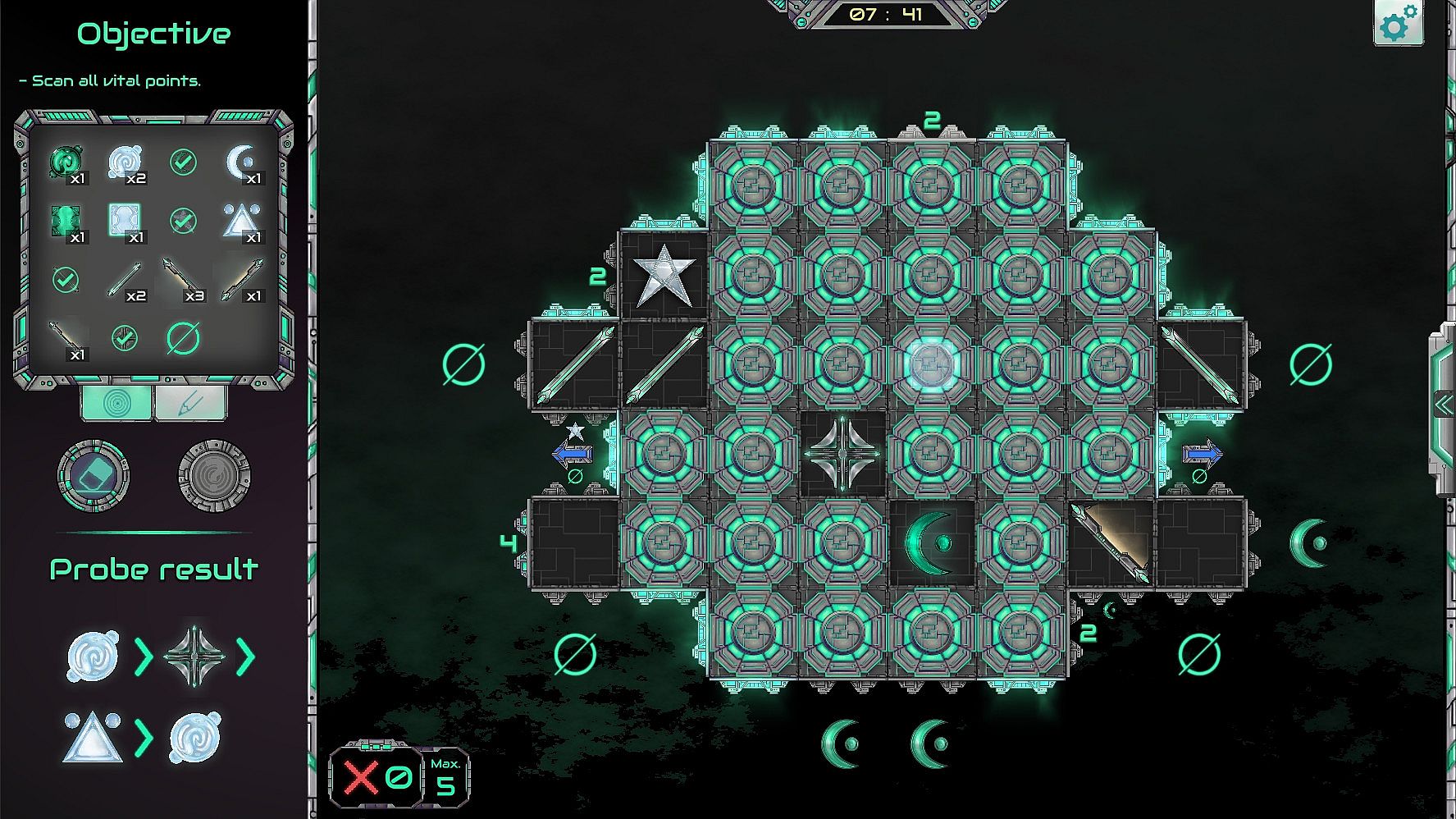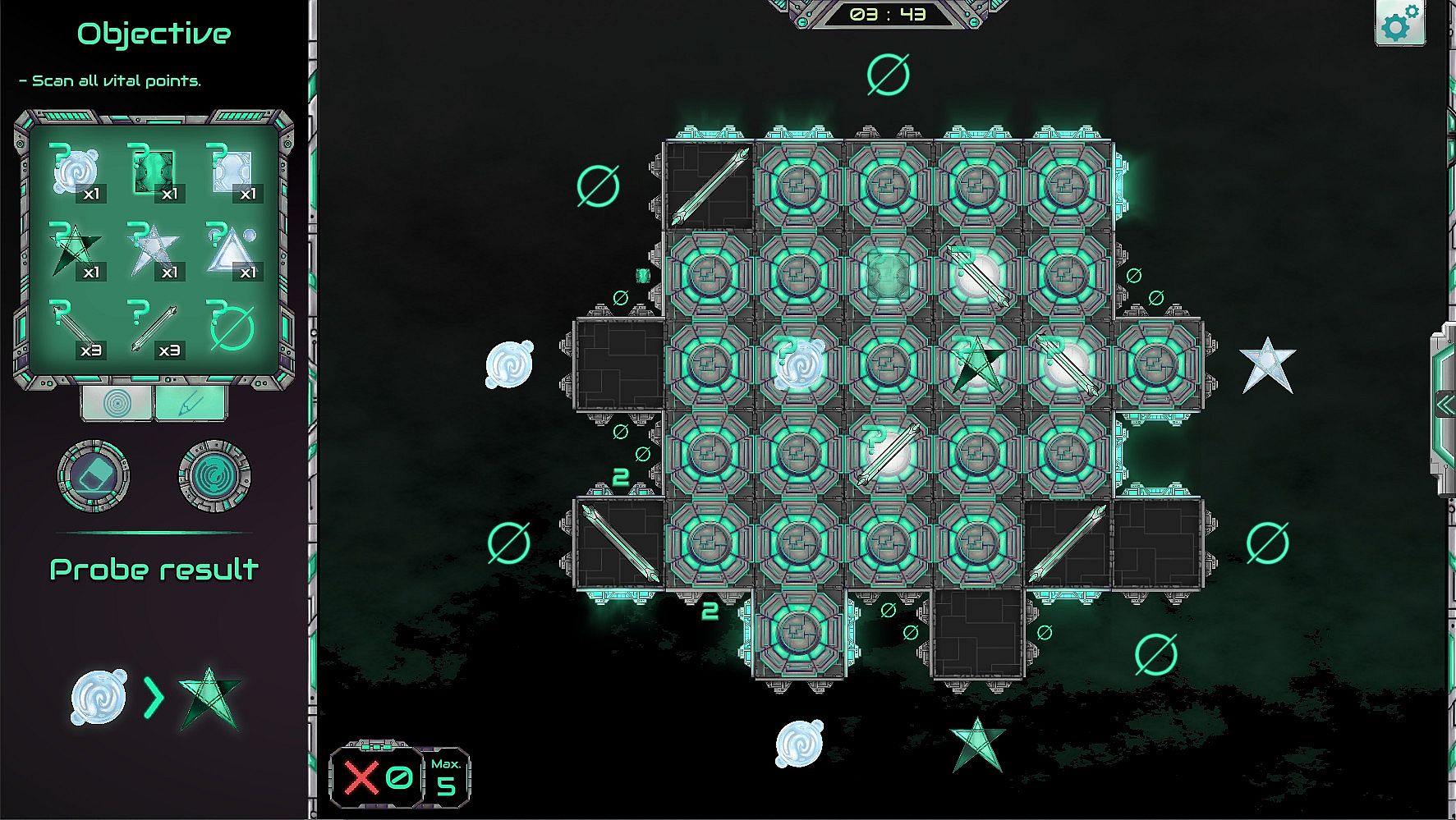 Closed levels: The contents of the Terebron are hidden. Use your probes to collect information, analyze the results, make your assumptions and scan the Terebron to find the vital points hidden inside. Unlike other modes where obstacles and objectives are clearly visible, this mode requires exploration, deduction, and strategic scanning to uncover the correct path forward.