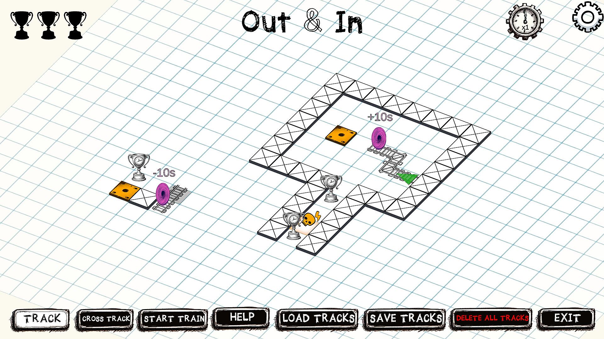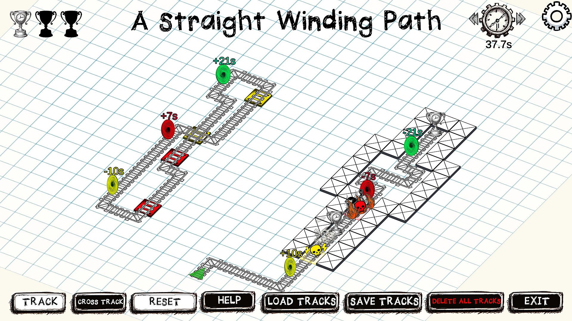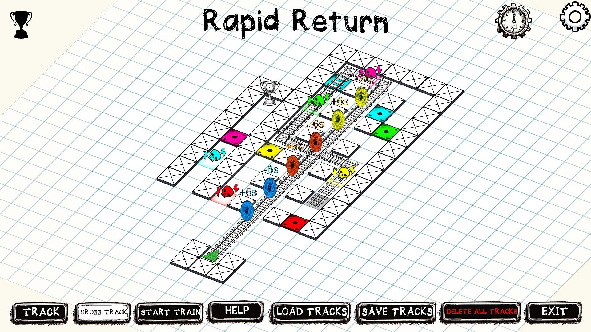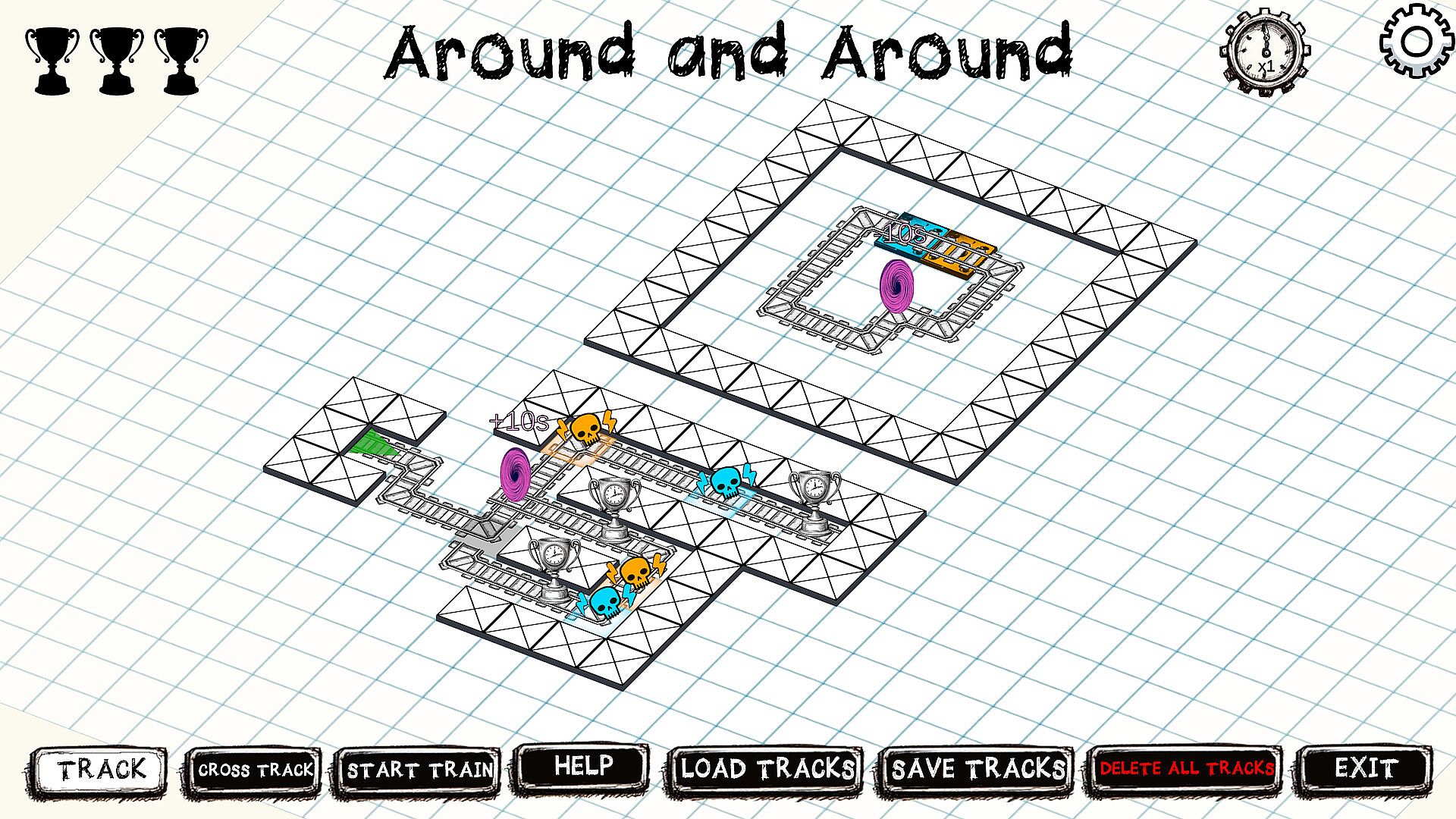 The number above each portal tells you how far back or forward in time it will send the train. To beat each level simply build a track that will send the TimeTrain to collect all the trophies scattered across the puzzle area. Be warned, however, as there are deadly traps that will destroy the TimeTrain if you do not deactivate them at the right time... and the right time might just be in the past or future!