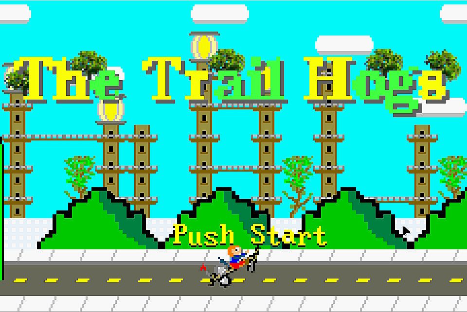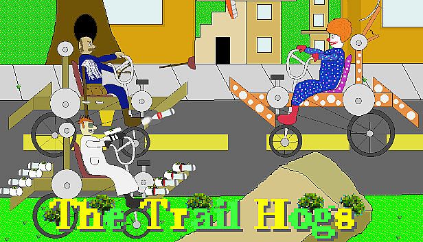 The Trail Hogs is a bicycle jousting game. Right now it is a 2D platform game similar to Super Mario except that you joust your opponent, whom is also on a bicycle, by running into him very similar to bumper cars. These bikes are also equipped with springs behind the rear axle to allow them to jump similar to a pogo stick, hence the high jump. In the game you ride a bike and battle opponents who have taken over various areas.