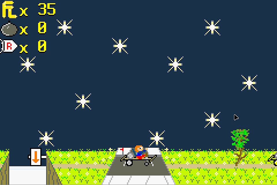 This game may be unique in that you can intentionally get soft blocked. Here is an example where your character can fall into a trap set up by the Skidmarks. If you get stuck here you must be rescued and to do that you must call a rescue. This is done by pressing the (R) on the keyboard or (L) on the gamepad. The rescue house is in the city and that's where you'll be taken.