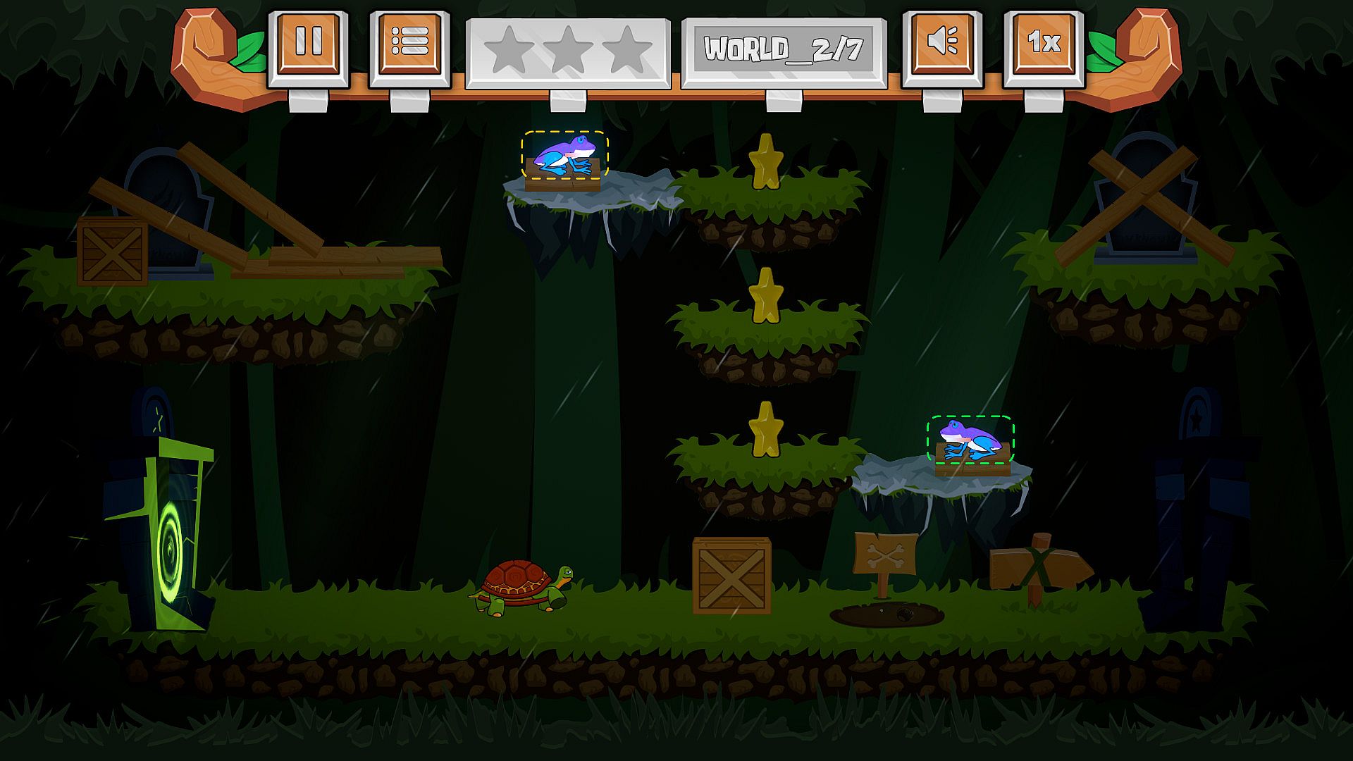 One twin turtle races through a portal system to rescue his brother from a monster's grasp. Exiting the portals reveals unexpected discoveries that guide his path forward. This indie adventure blends platforming with puzzle challenges across themed worlds. Players navigate 72 unique levels spread over 8 worlds, each with branching paths to explore. Simplified controls pair with colorful graphics, animations, and special sound effects for smooth play. Story-driven gameplay in 12 languages suits casual strategy fans of all ages.