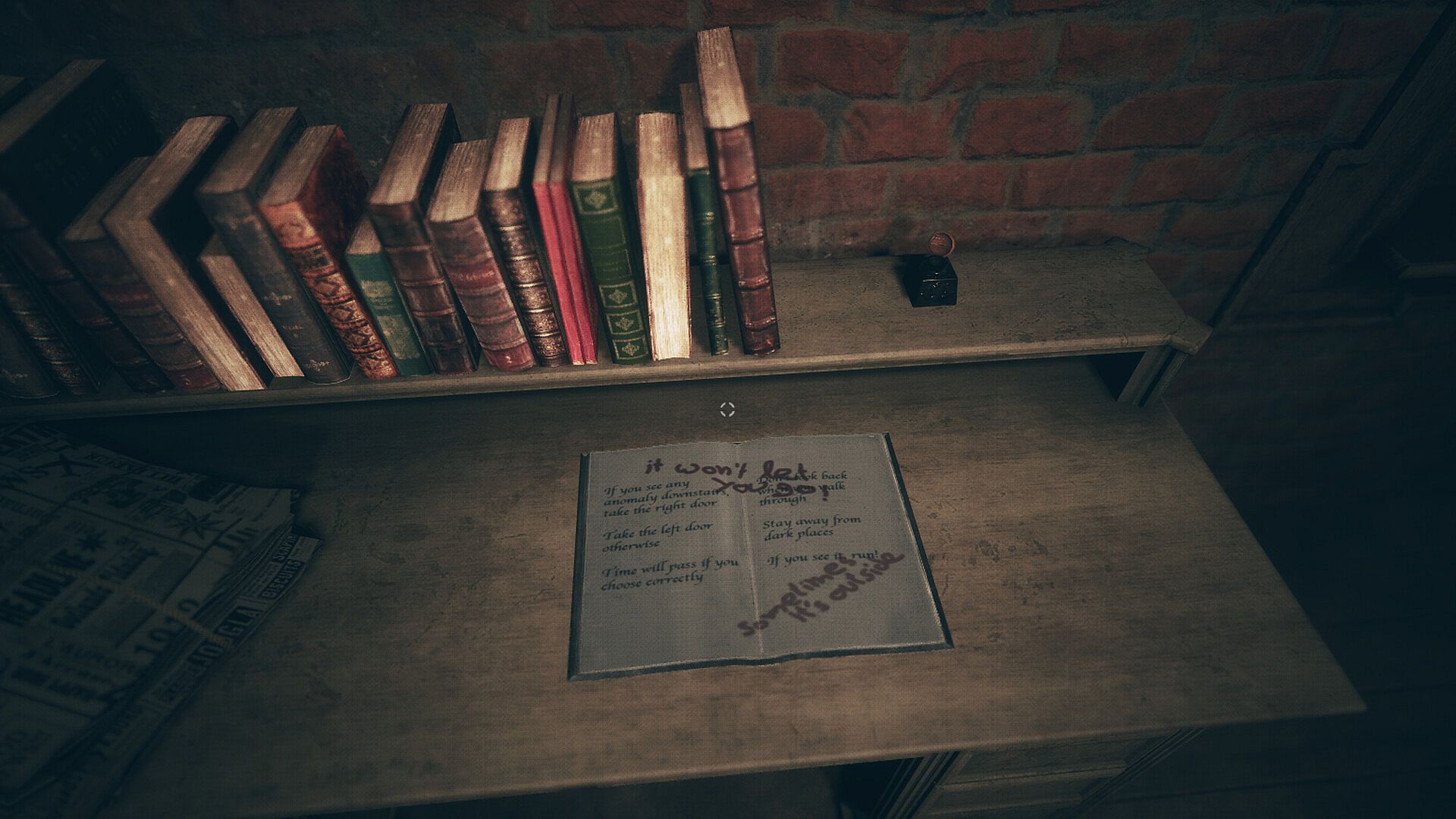 At the end of the room, you are faced with two doors. If you have discovered an anomaly, choose the right door to move forward. If everything appears unchanged, take the left door. But beware: a wrong choice could lead you deeper into the darkness and into the clutches of the creatures lurking in the shadows.