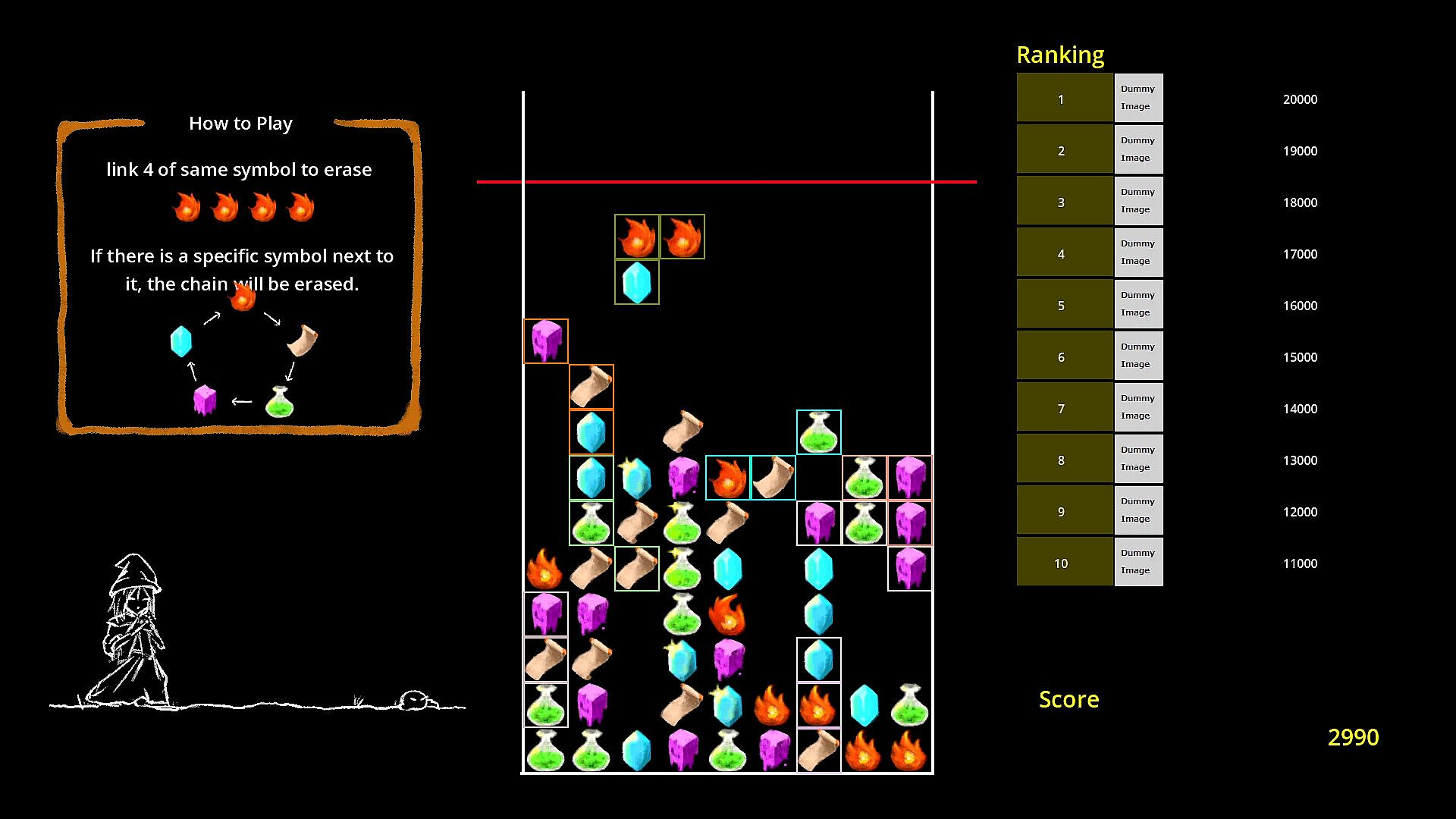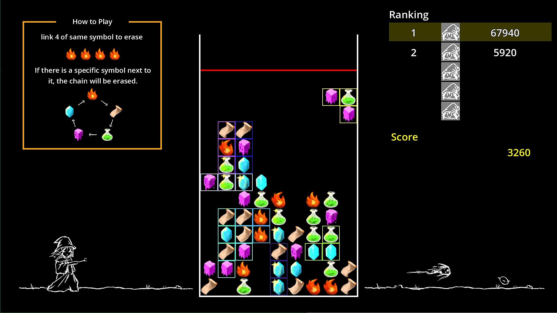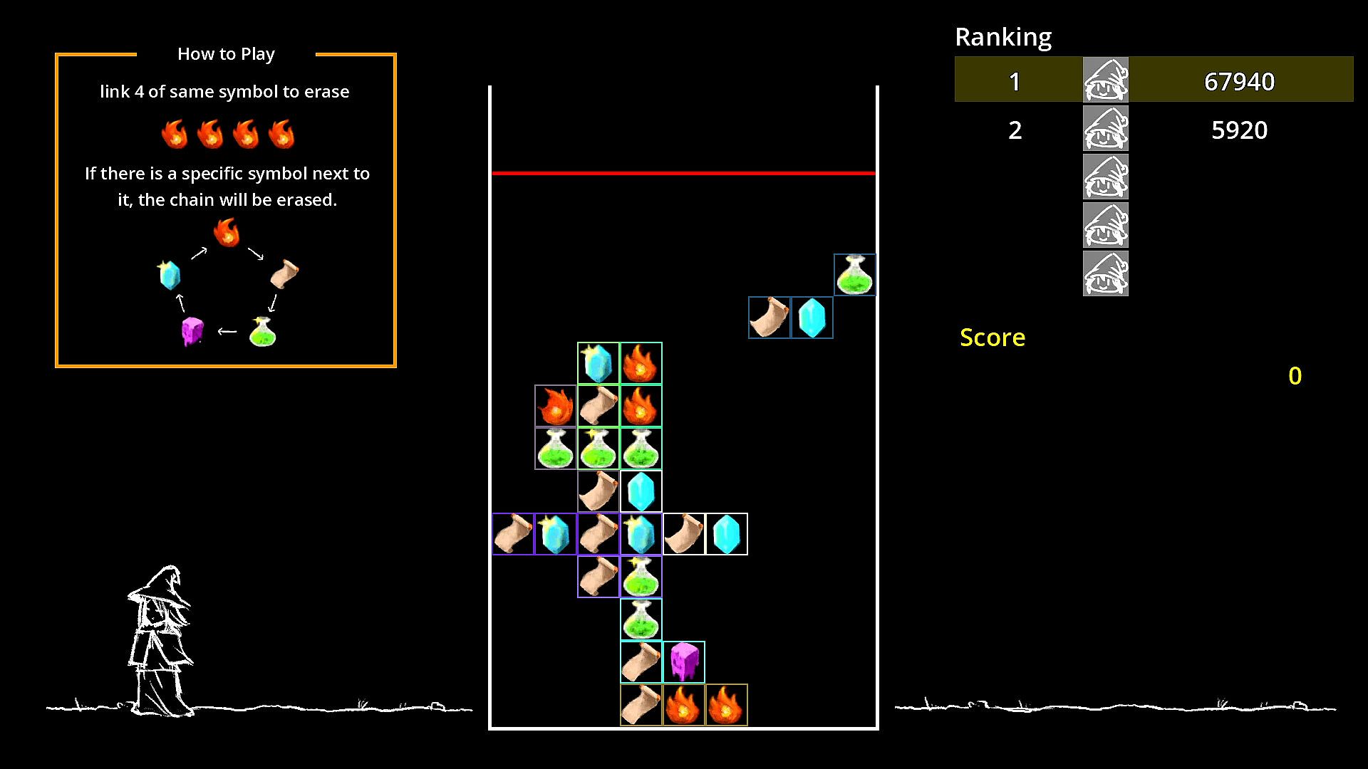 By rotating the falling blocks and connecting four or more of the same symbols, the connected identical symbols will be Vanish.