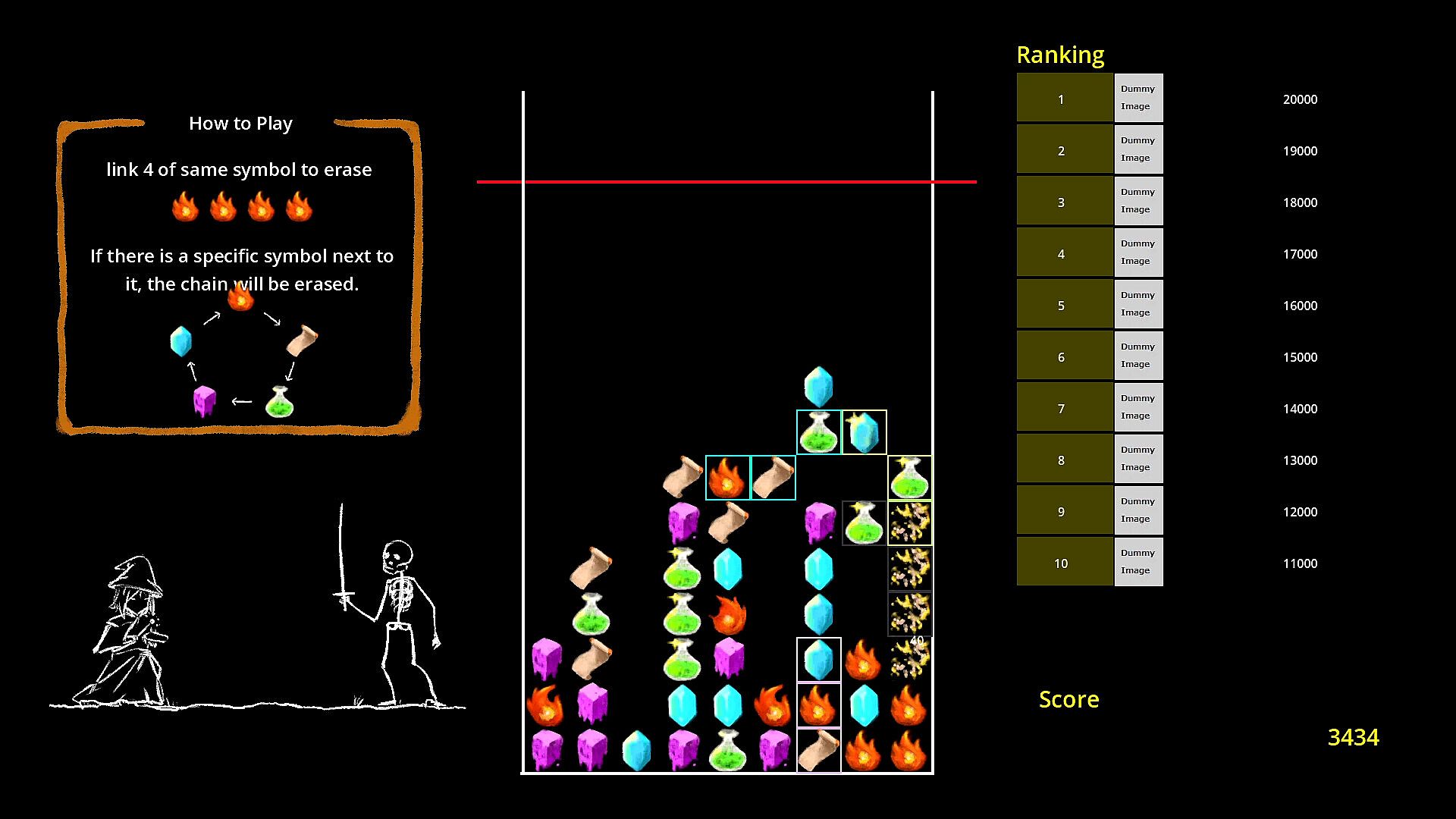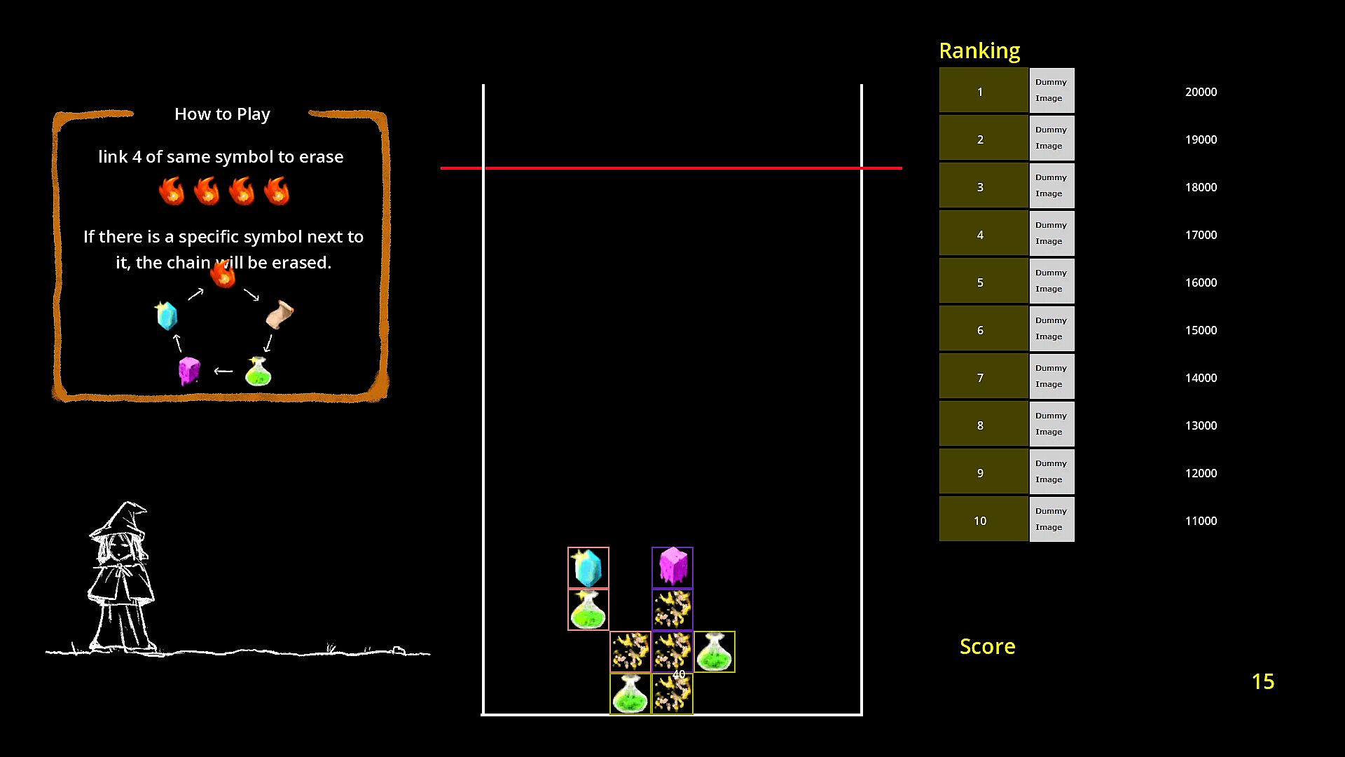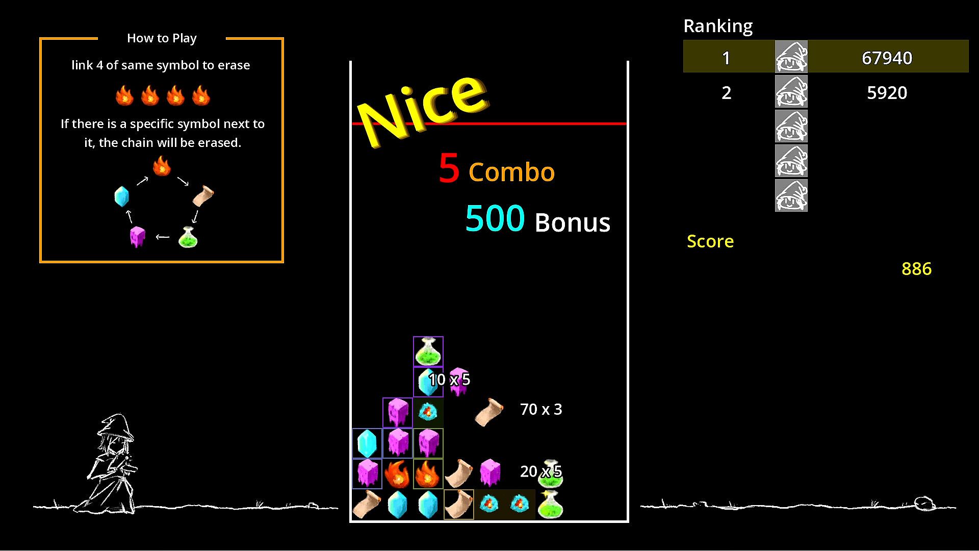 By rotating the falling blocks and connecting four or more of the same symbols, the connected identical symbols will be Vanish.