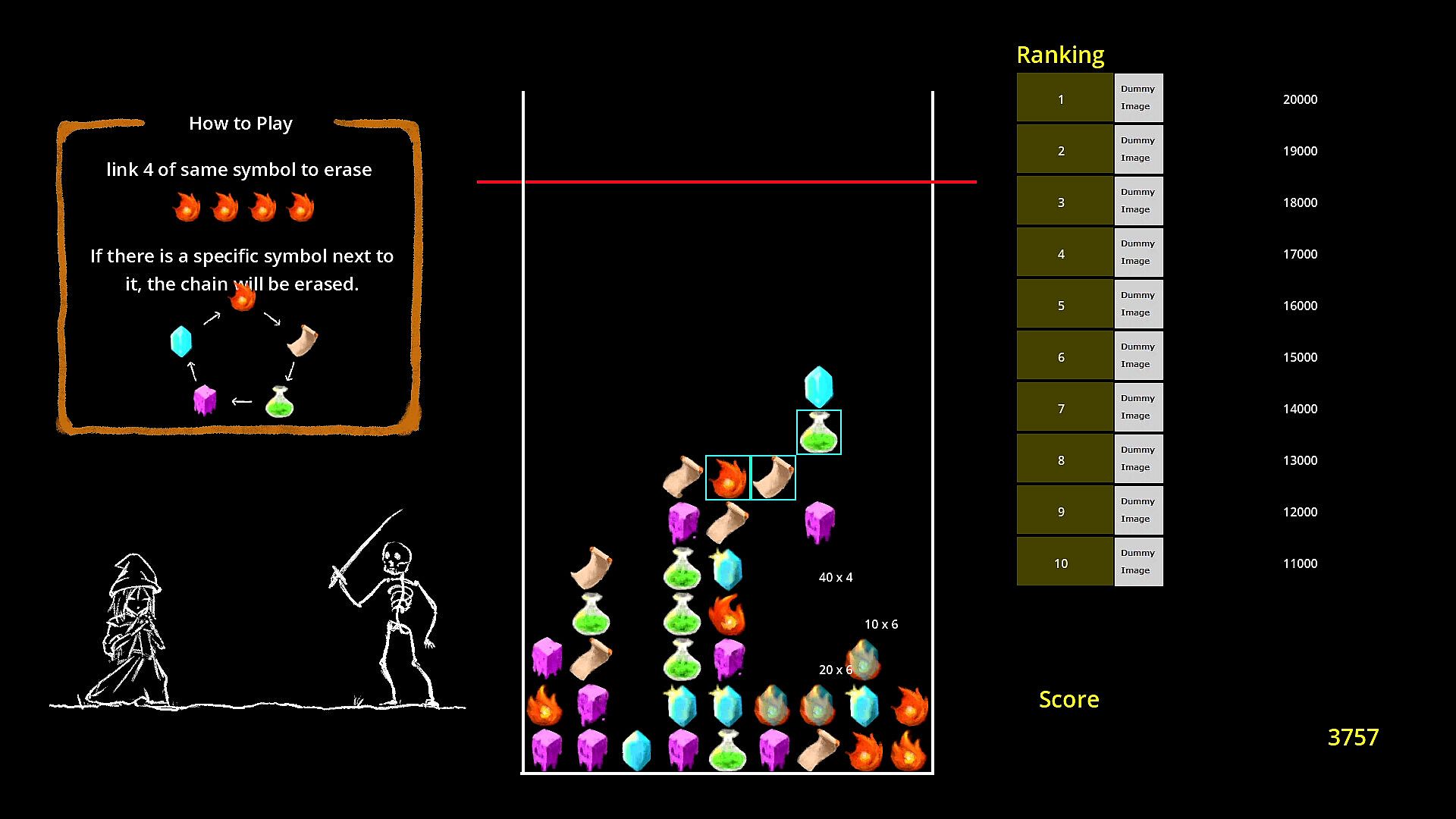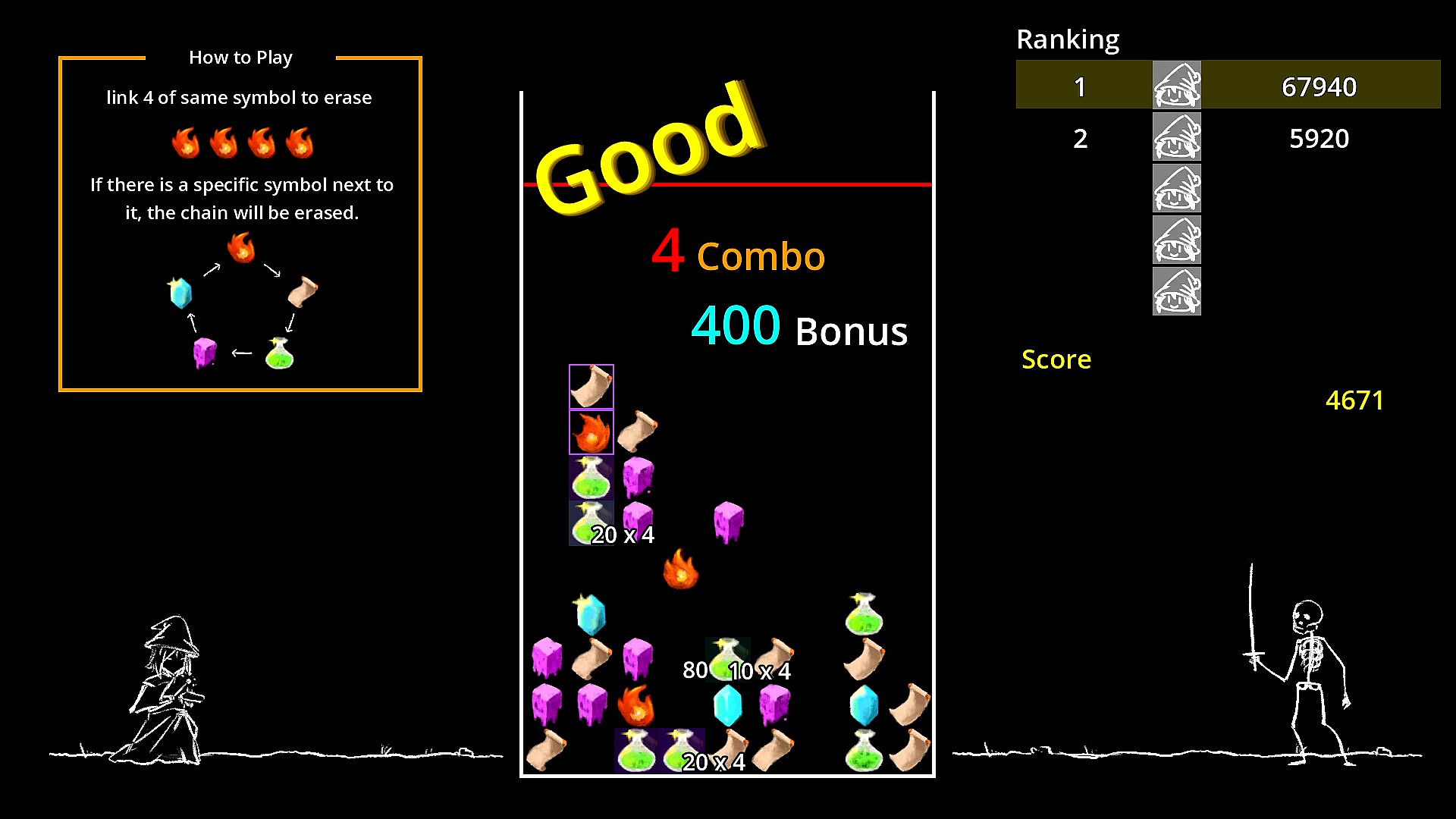 A a bit unique about Vanishtan. when four or more connected symbols are Vanish, the other symbols next to them are Vanish in a chain reaction. For example, if four ice symbols are connected and Vanish, Adjacent fire symbols will be Vanish in a chain reaction.