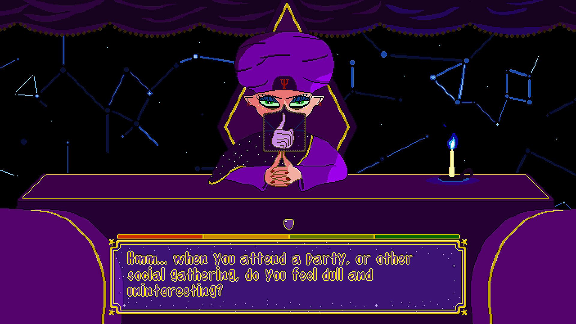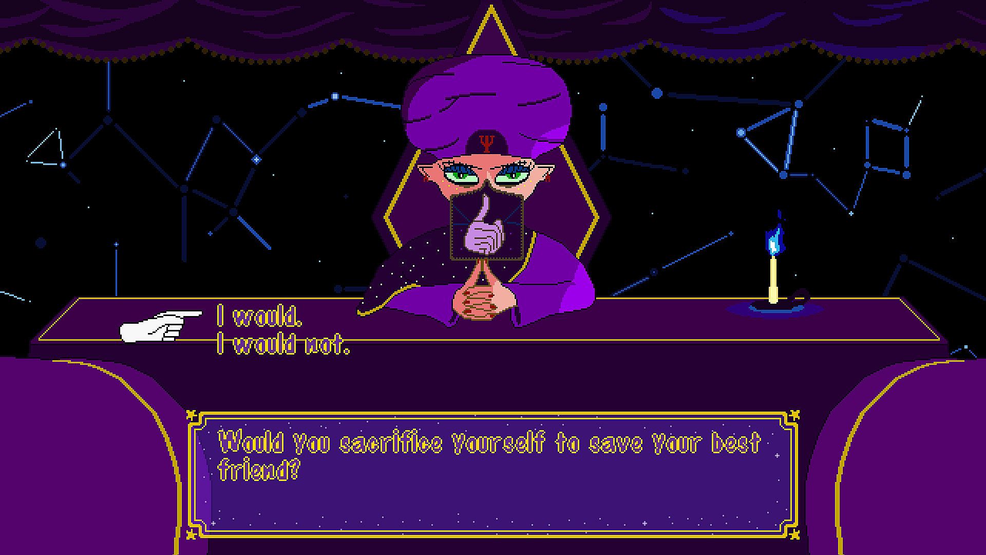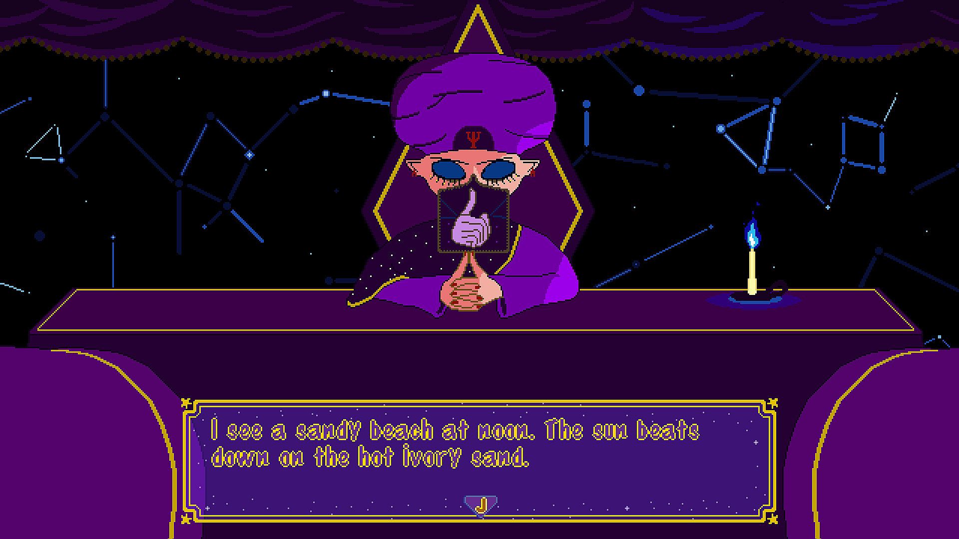Die eigene Zukunft zu erblicken ist schwieriger als einen Blick ins morgige Geschehen zu werfen. In dieser kurzen Indie-Simulation triffst du in einem mysteriösen Zirkuszelt, versteckt in den düsteren Gassen von Bagdul - einer Saphirstadt inmitten endloser Dünen - auf die neugierige Vespa. Beantworte über 100 introspektive Fragen zu deinem Leben und deiner Weltanschauung, während sie deine Gegenwart durchleuchtet und deine tiefsten Dämonen ans Licht zerrt. Deine Entscheidungen formen eines von vielen maßgeschneiderten Enden, die Verhaltensmuster widerspiegeln. Die Spielzeit beträgt rund 15 Minuten in einem entspannten, atmosphärischen Casual-Erlebnis für PC. Perfekt für Spieler, die schnelle, nachdenkliche Selbsterkenntnis durch Persönlichkeitstests suchen.