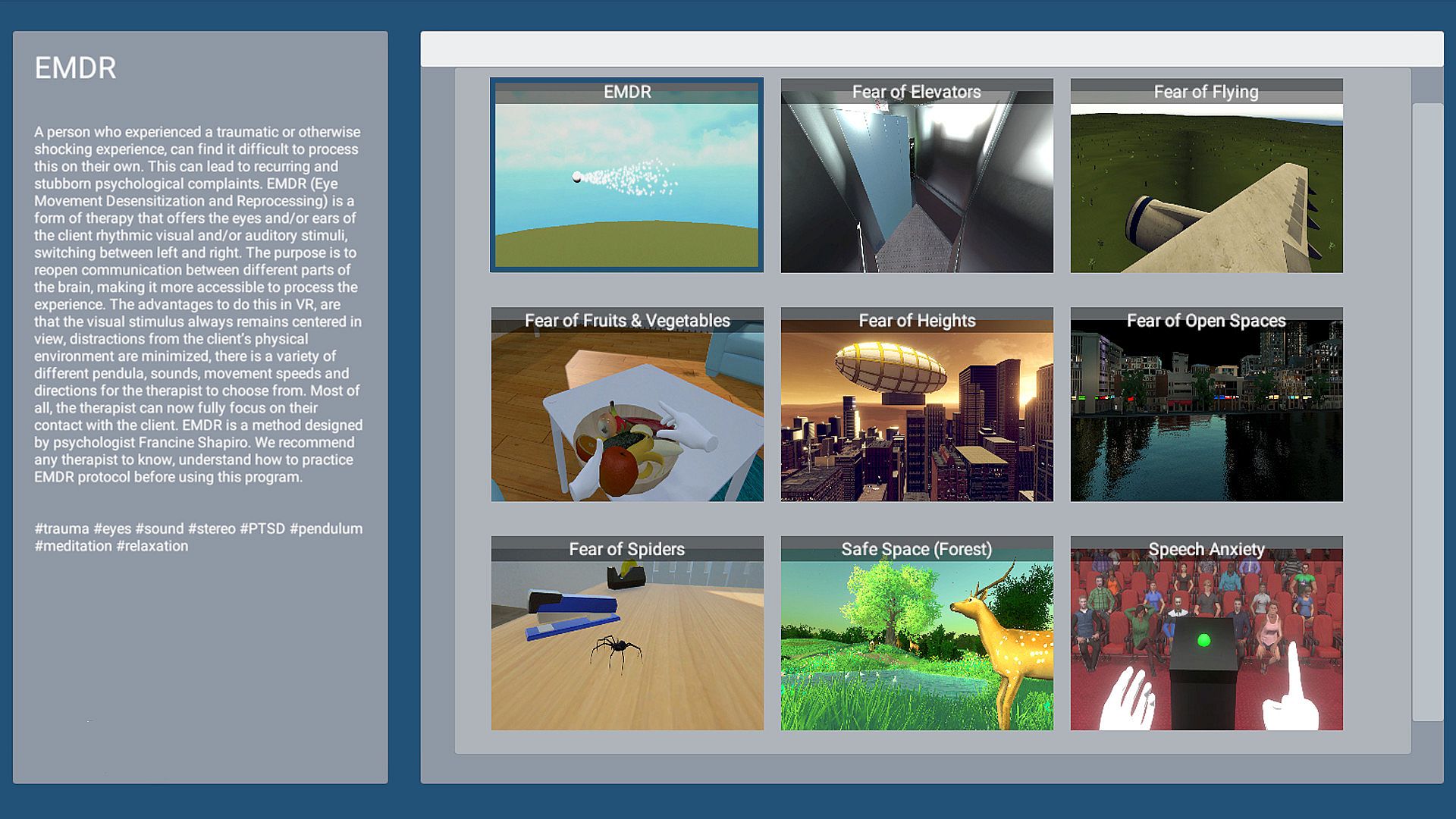 Vrerience dient als Hub für diverse Therapieprogramme, die jeweils als eigenständiger Modus fungieren. Die Bibliothek umfasst derzeit Grundlagen-Erlebnisse, während Spezialisierungen wie Breathing Exercises und Fear of Bridges in Arbeit sind. Diese Modi bieten gezielte VR-Szenarien, etwa geführte Atmungsübungen oder Simulationen gegen spezifische Phobien.