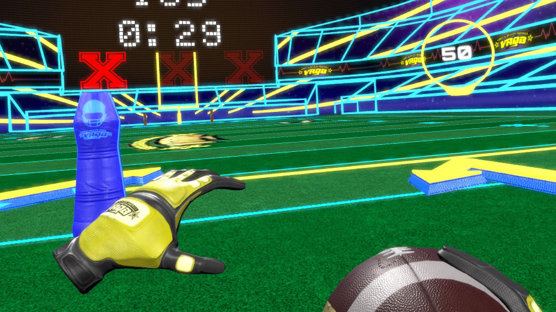 In Scramble mode, the player dodges the VRQB tackling dummies while trying to score as many touchdowns as possible. Be careful, as after each touchdown scored, the dummies will increase their speed and spawn rate. You can be tackled three times before your round is over, so don't give up after taking your first hit!