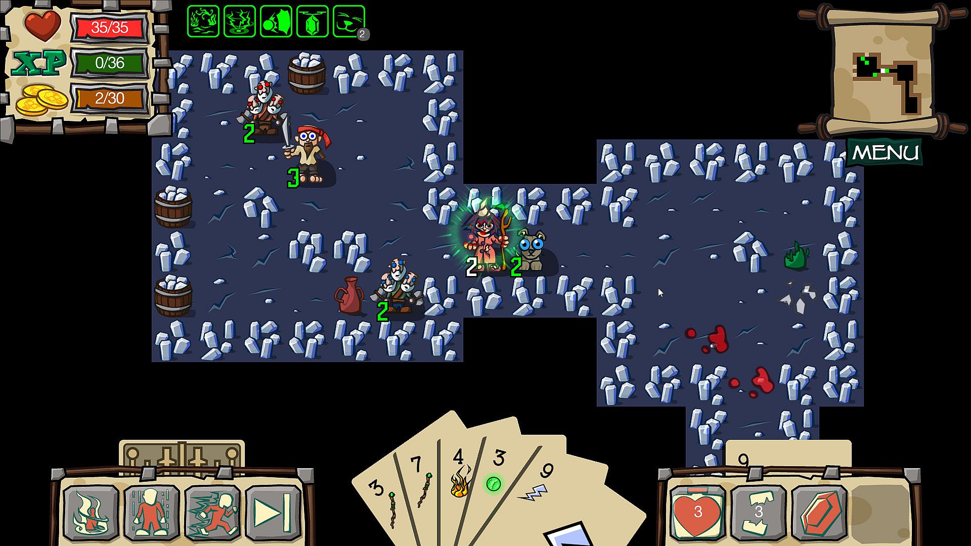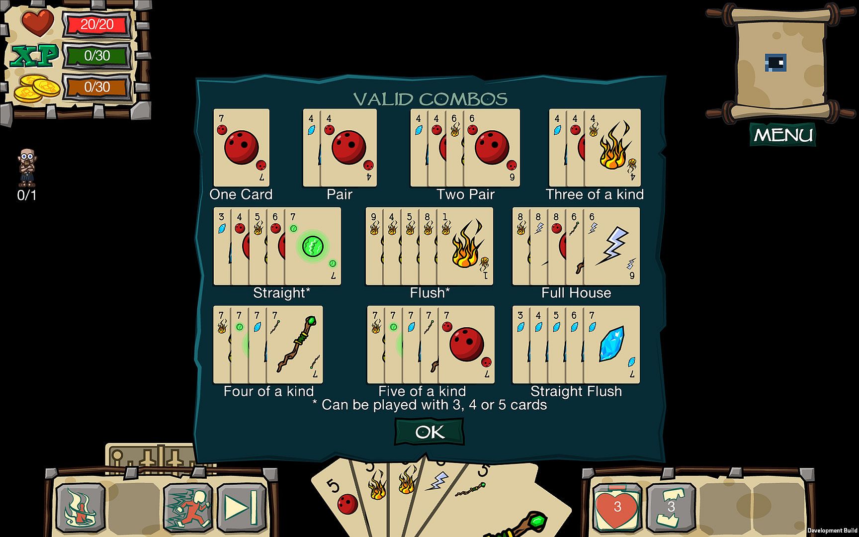 • Poker-esque card-based combat mechanic. Most hands that would be valid in poker are valid here, except the deck is made up of six suits instead of four, with face values from 1-9 instead of Ace-King. Flushes can be made with only three of the same suit, and any flush results in a super attack. Each suit has a unique attack ability.