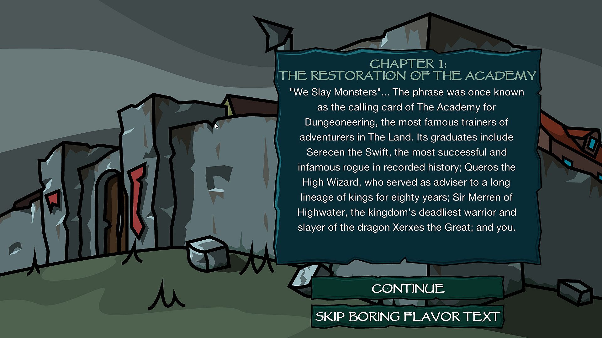 In We Slay Monsters, the player is tasked with the rebuilding of the once prestigious Academy For Dungeoneering, famous for training generations of heroes, but long since fallen into disrepair.