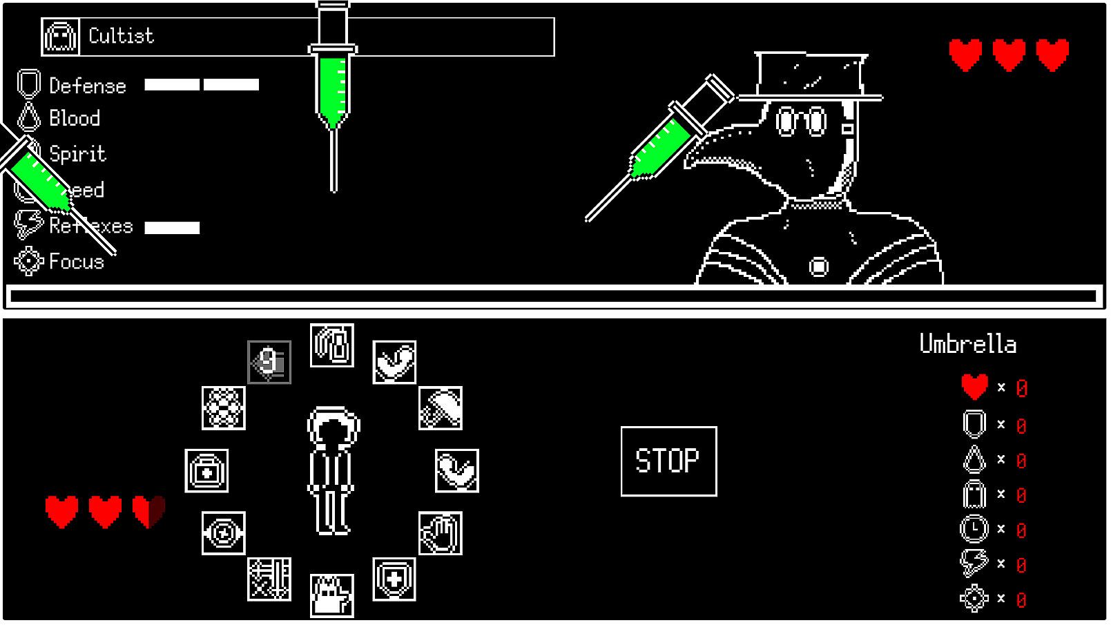 During combat, you can make use of different abilities that appear as boxes surrounding your character to deal damage, dodge, parry, heal and more. Watch out for the enemies' attacks as they don't wait for you to be ready like in a classic turn-based combat game.