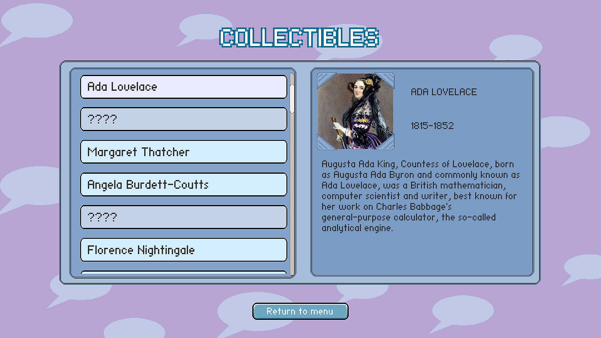 Women's Quiz ist ein Trivia-Quiz, das die Leistungen einflussreicher Frauen aus der Geschichte ins Rampenlicht rückt. Dieses Indie-Casual-Game für PC lädt Spieler ein, ihr Wissen in einer Reihe fesselnder Fragen unter Beweis zu stellen - eine clevere Mischung aus Bildung und spielerischem Wettbewerb. Ob ihr Fakten über Pionierinnen wie Marie Curie wiederholt oder die Vermächtnisse von Persönlichkeiten wie Frida Kahlo entdeckt, das Spiel bietet Trivia-Fans und Geschichtsinteressierten ein unkompliziertes, aber lohnendes Erlebnis.
