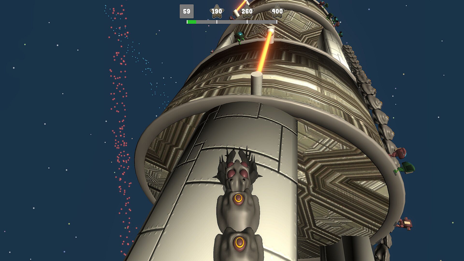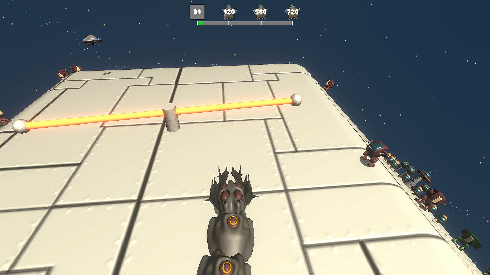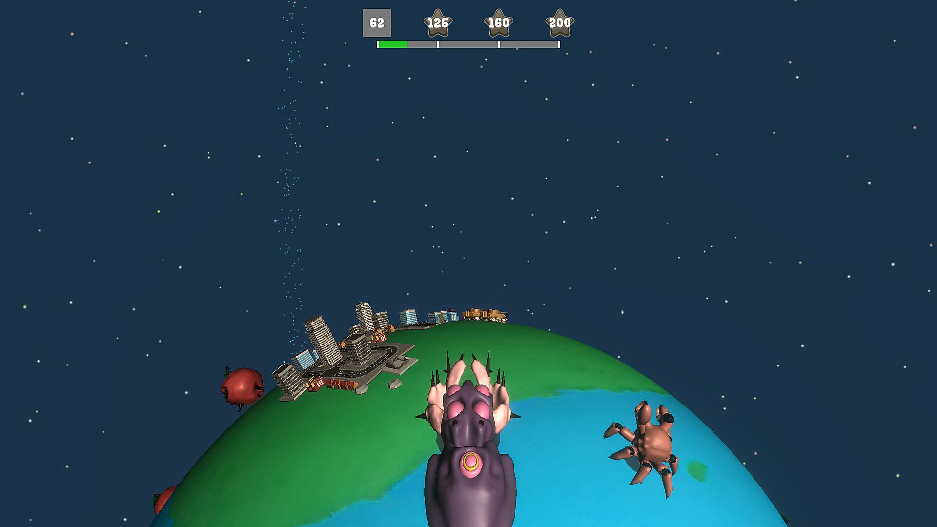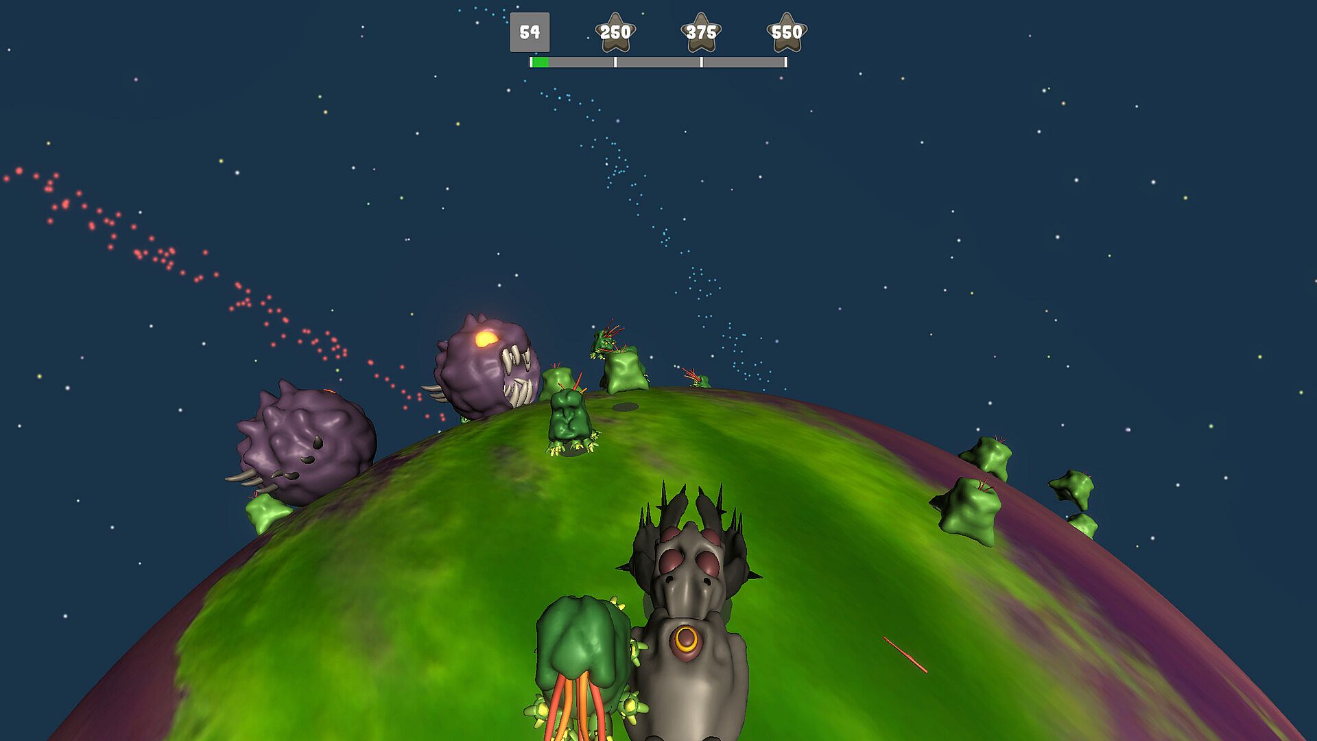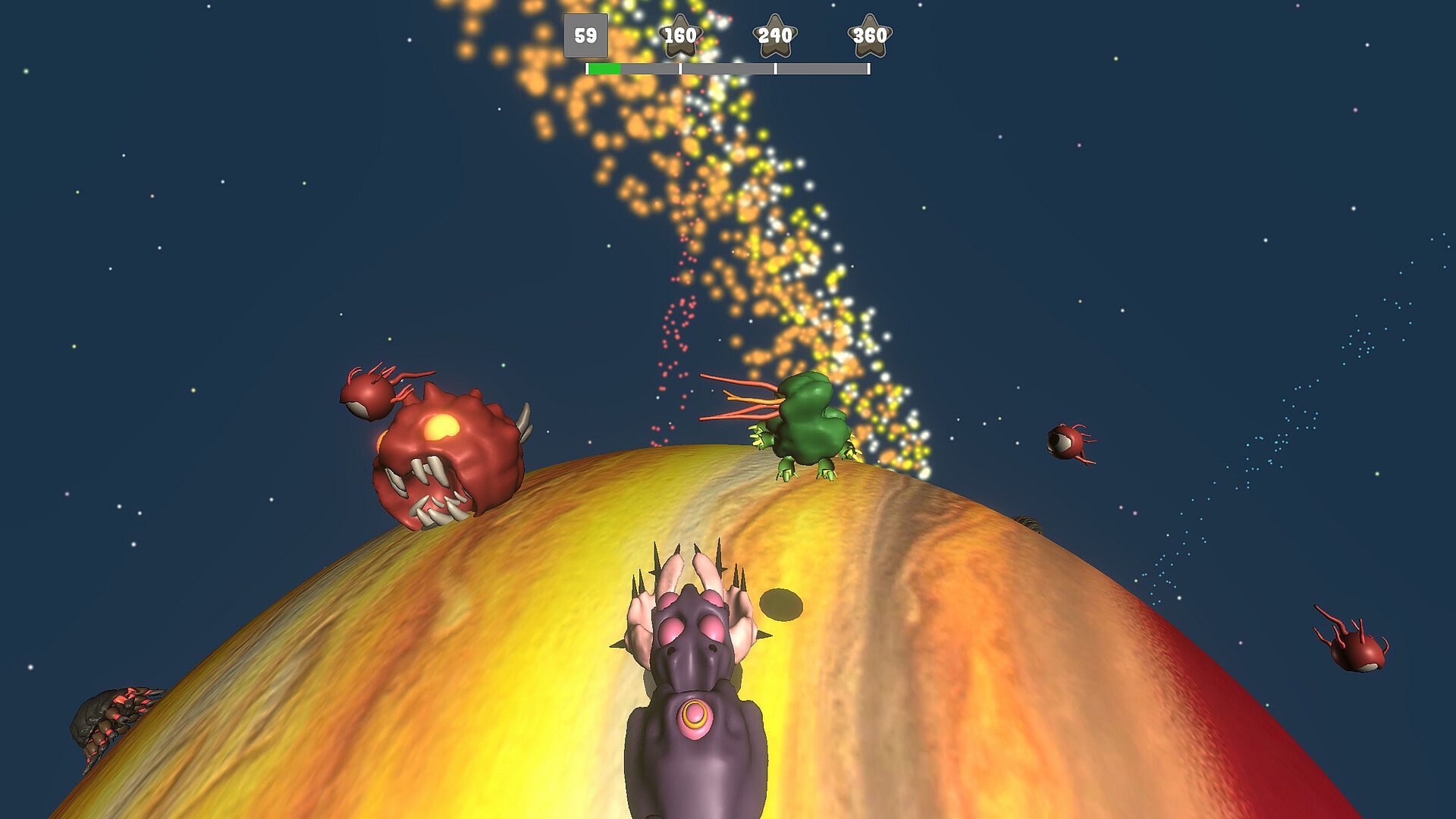 Game stages are mostly planets or some type of cosmic mega structure, giving unique experience in different stages - mostly round shape surfaces, different gravity levels each planet and sometimes completely impossible physics. Each stage is filled with monsters and destructible environment objects and sometimes hazardous objects.