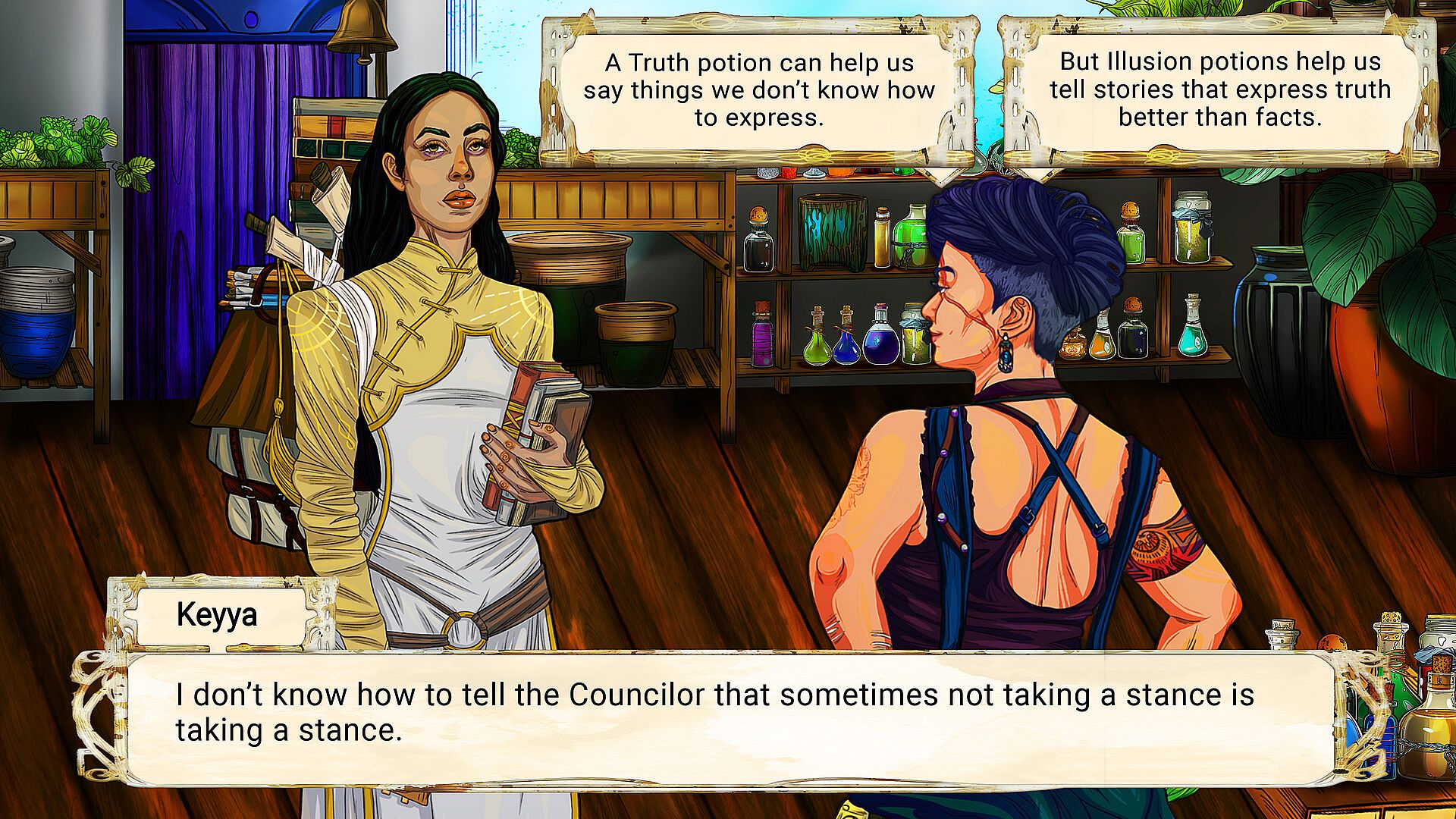 Welcome to Malavar, a nation of lush jungles and liberality. A definite improvement over your country of birth. You are Xochi, an alchemist of relentless talent and sarcastic wit. You’ll be too busy managing your shop to get out much, but as you play host to everyone from councilors to artists to assassins, you’ll discover your new country by getting to know its people.