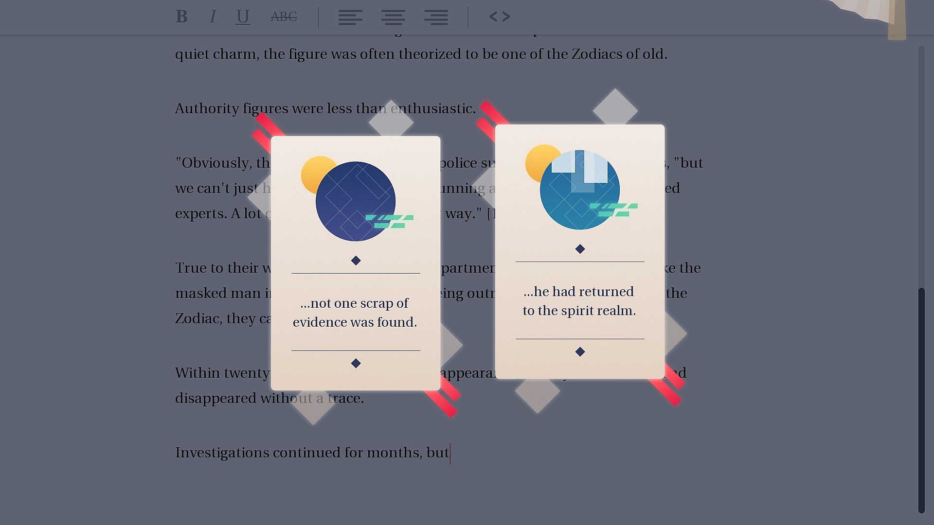 Play as Alison Hart, a fresh-out-of-college journalism graduate who is shortly employed at an infamous online tabloid. At first, you're not worried—even when you're assigned to investigate six people who are rumored to carry the Spirits of the Zodiacs. It's just a nonsensical tabloid job. Right?
